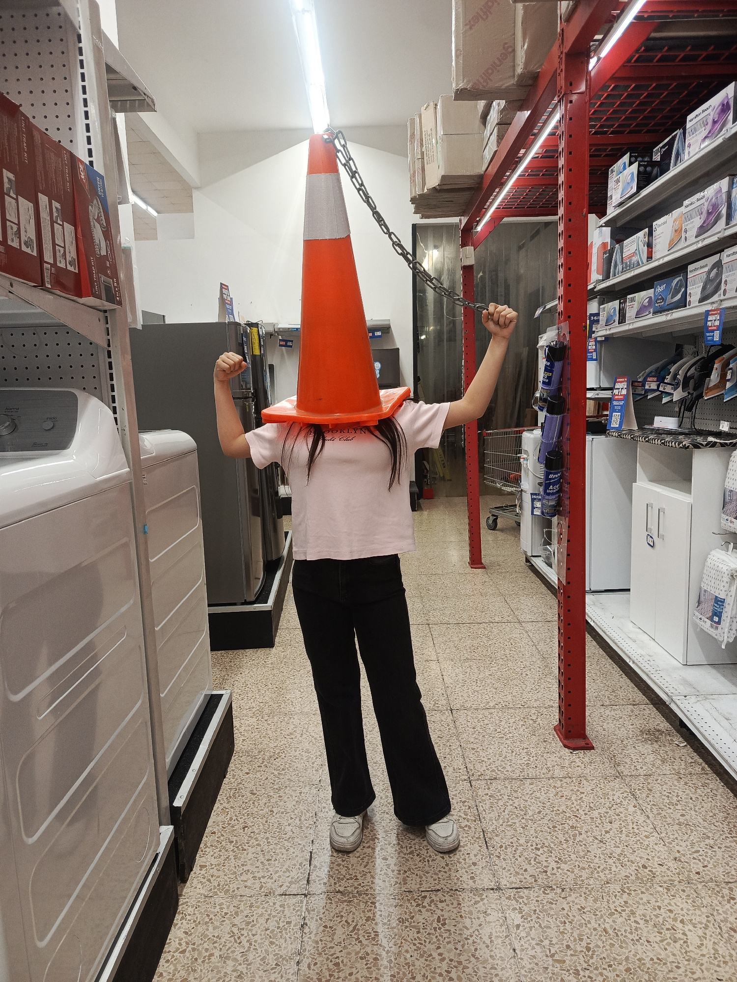 A medium shot depicts a person standing in a well-lit store aisle with a traffic cone on their head. The person has their arms raised, holding onto a chain that dangles from the cone. The individual w…read more