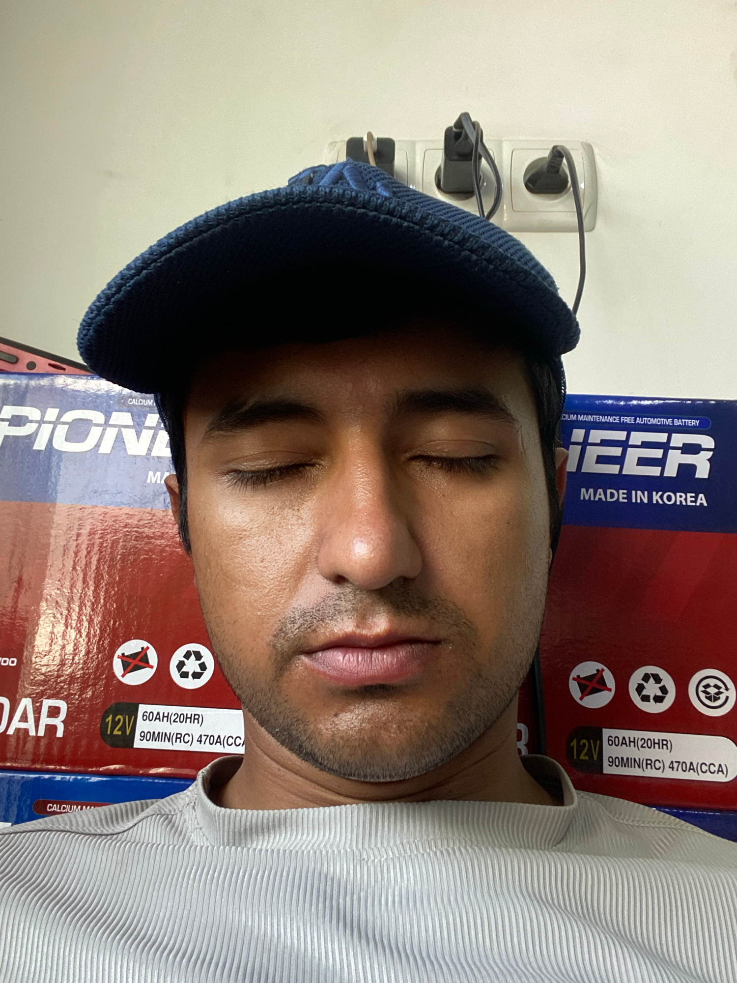 A man is lying on top of two battery boxes, sleeping. The battery boxes are red and blue and have the brand name "Pioneer" printed on them. The man is wearing a blue knitted cap and a white striped sh…read more