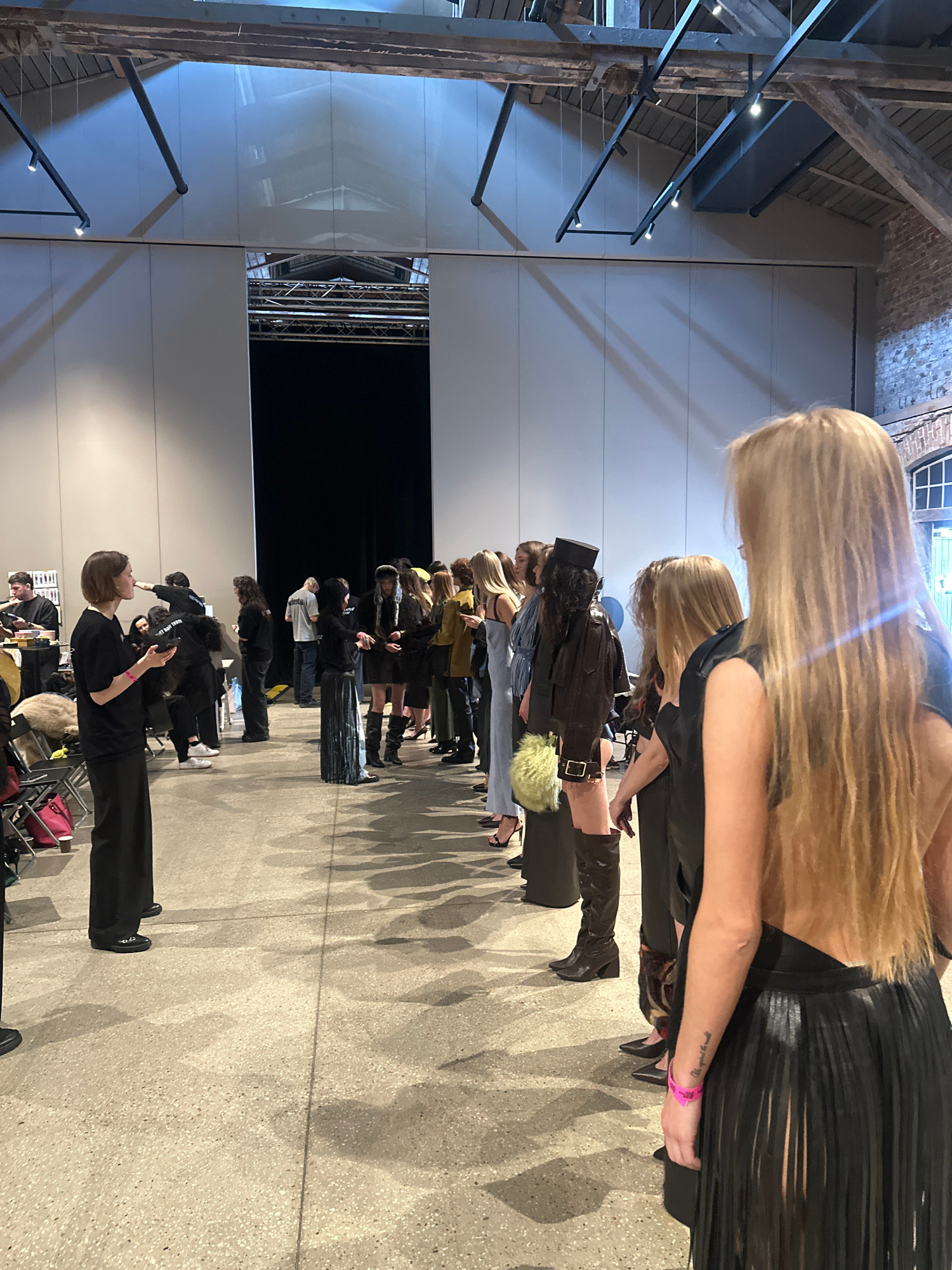 The image captures an indoor scene, likely a backstage or pre-show area at a fashion event in Riga, Latvia. A long line of people, predominantly women, stretches into the background against a plain li…read more