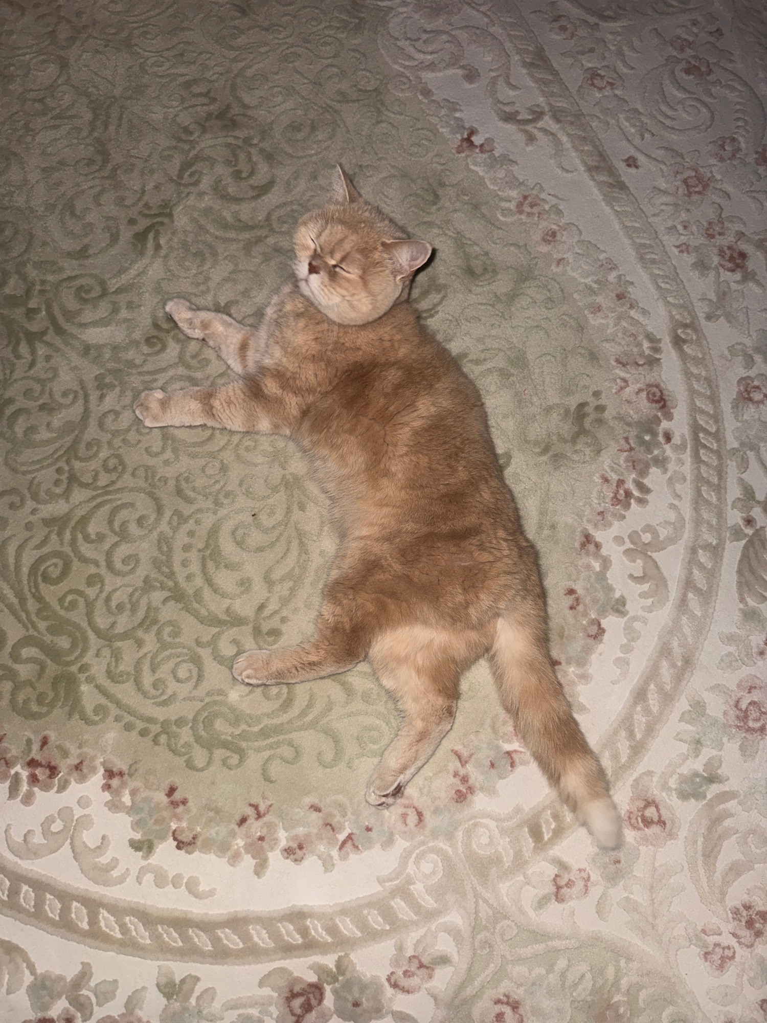 A beige cat is lying on a patterned rug. The cat is positioned diagonally across the frame, with its head near the upper left corner and its tail extending towards the upper right. The rug has an intr…read more