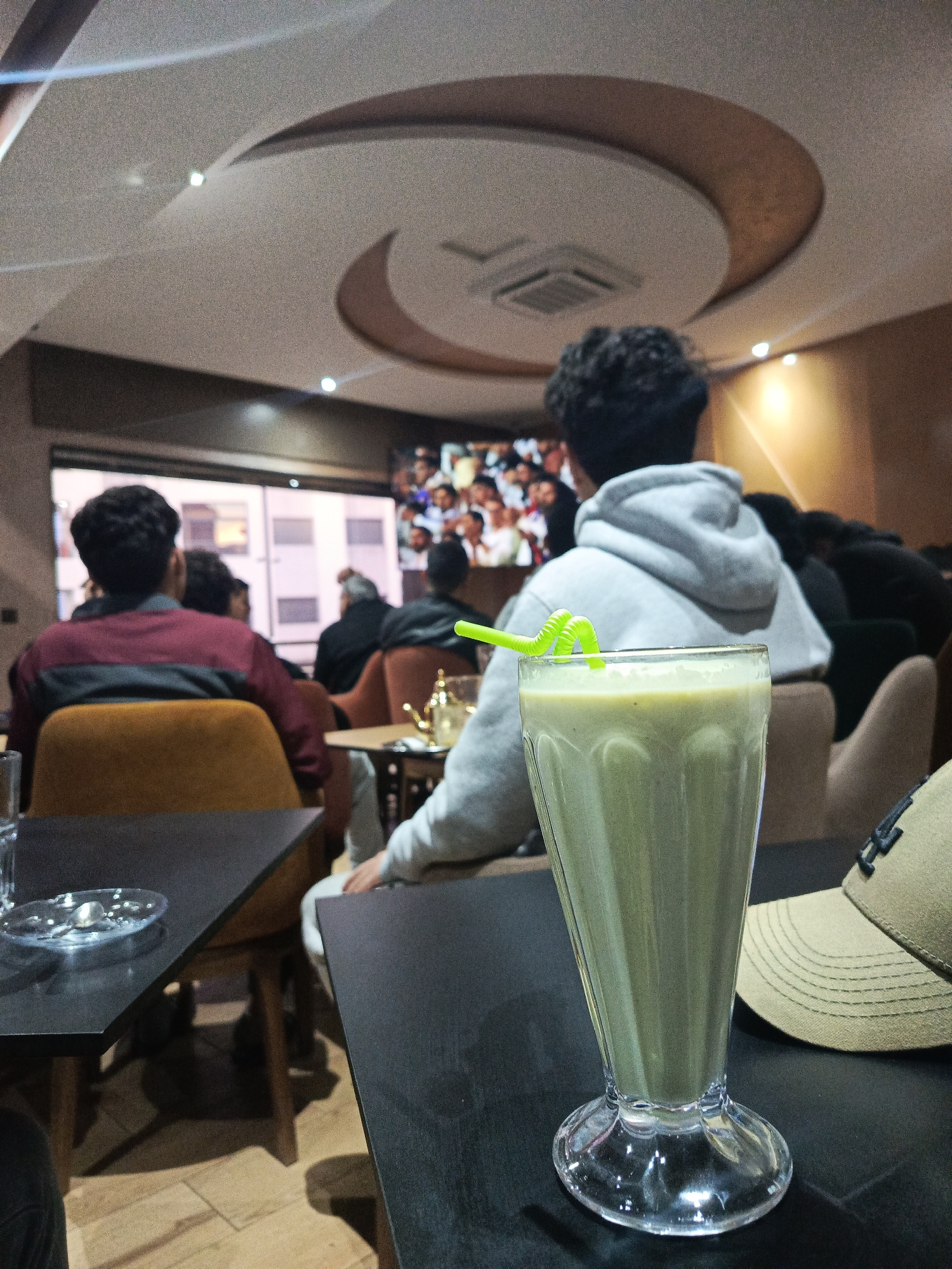 A daytime scene in a cafe in Meknes, Morocco. Several people are seated at tables, looking towards a large screen displaying a crowd of people. One person is facing away from the camera wearing a lighβ¦read more