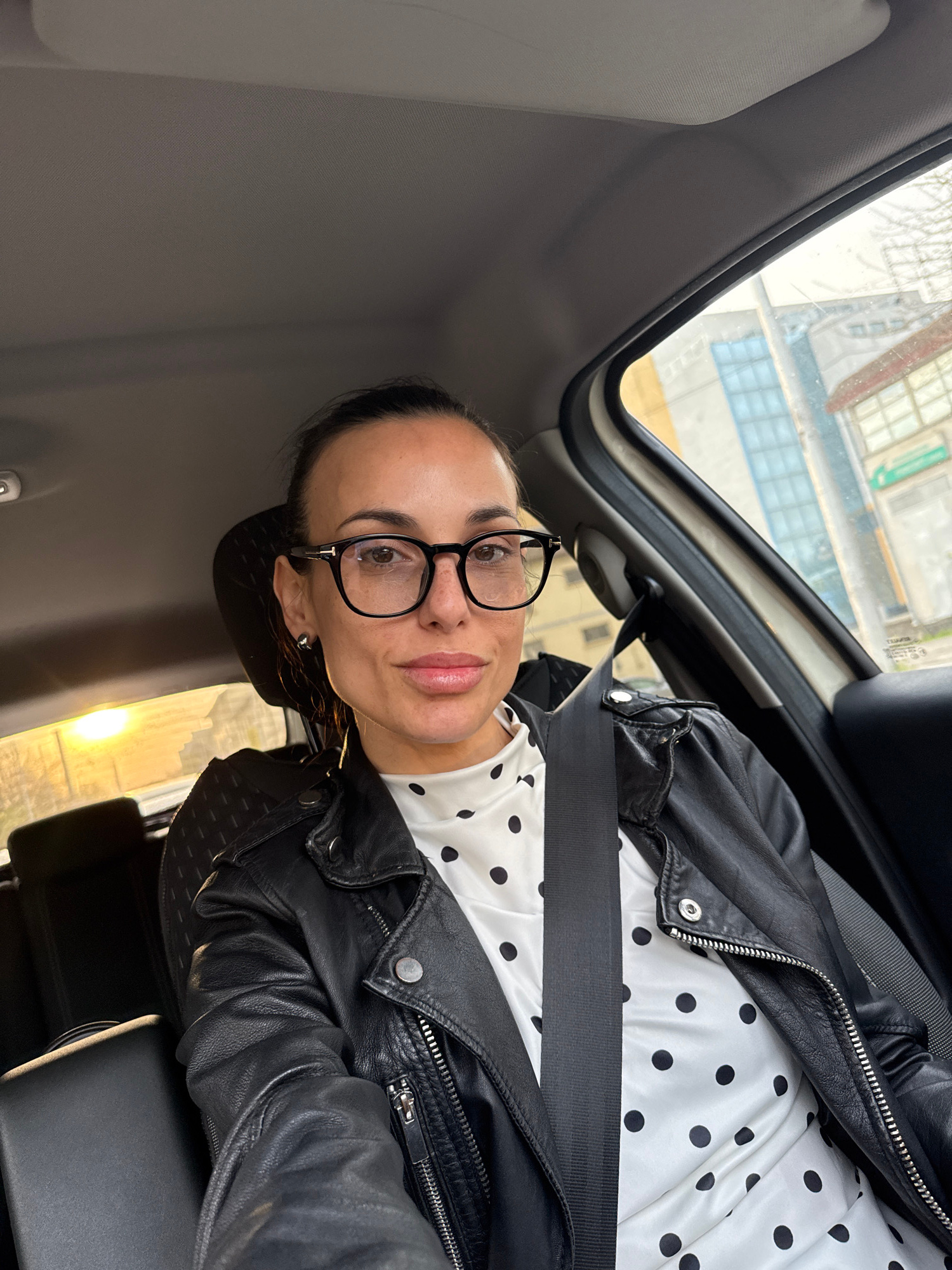 The image shows a woman in a car, wearing glasses, a black leather jacket, and a white polka dot shirt. She is wearing a seatbelt. The interior of the car is visible, including the ceiling and part of…read more