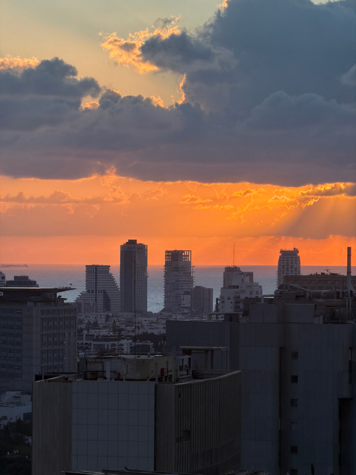 An elevated, wide-angle shot captures a sunset over the Mediterranean Sea and the Tel Aviv-Jaffa skyline, viewed from a high vantage point in Ramat Gan, Israel. The upper half of the frame is dominateβ¦read more