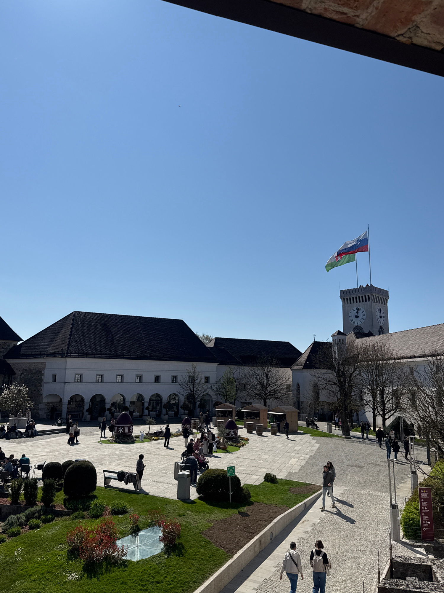 The image captures a sunlit daytime scene within the main courtyard of Ljubljana Castle in Ljubljana, Slovenia, viewed from a slightly elevated position. A clear blue sky dominates the upper portion o…read more