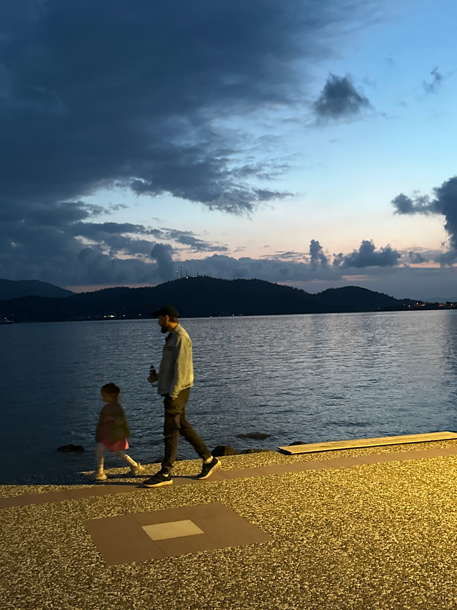 The image captures an evening scene at dusk along a brightly illuminated waterfront promenade in Fethiye, Turkey. Two individuals, an adult male and a child, are depicted walking from right to left across the foreground. The adult male, silhouetted against the water, wears a dark cap, a light-colored, possibly denim-style jacket, dark trousers, and dark athletic shoes with light soles; he carries a dark bottle in his right hand. Slightly ahead of him is a child, also partially silhouetted, wearing a light-colored top, a pink skirt or dress, light leggings, and light shoes. The immediate foreground features a textured, light-colored aggregate promenade surface, strongly illuminated by an unseen artificial light source to the right, creating warm tones. This surface incorporates darker, reddish-brown rectangular and linear decorative patterns. Adjacent to the promenade, a calm body of water, likely the Fethiye Bay, extends into the mid-ground, with faint ripples visible. A dark wooden plank or similar structure rests at the water's edge on the far right. Across the water, dark, undulating hills or mountains are silhouetted against a sky transitioning from a deep twilight blue near the horizon to darker, heavy grey clouds overhead. Sparse artificial lights are visible on the distant hillsides, indicating structures or distant settlements. The overall atmosphere is one of peaceful evening activity along a well-lit coastal path. | Open Wire