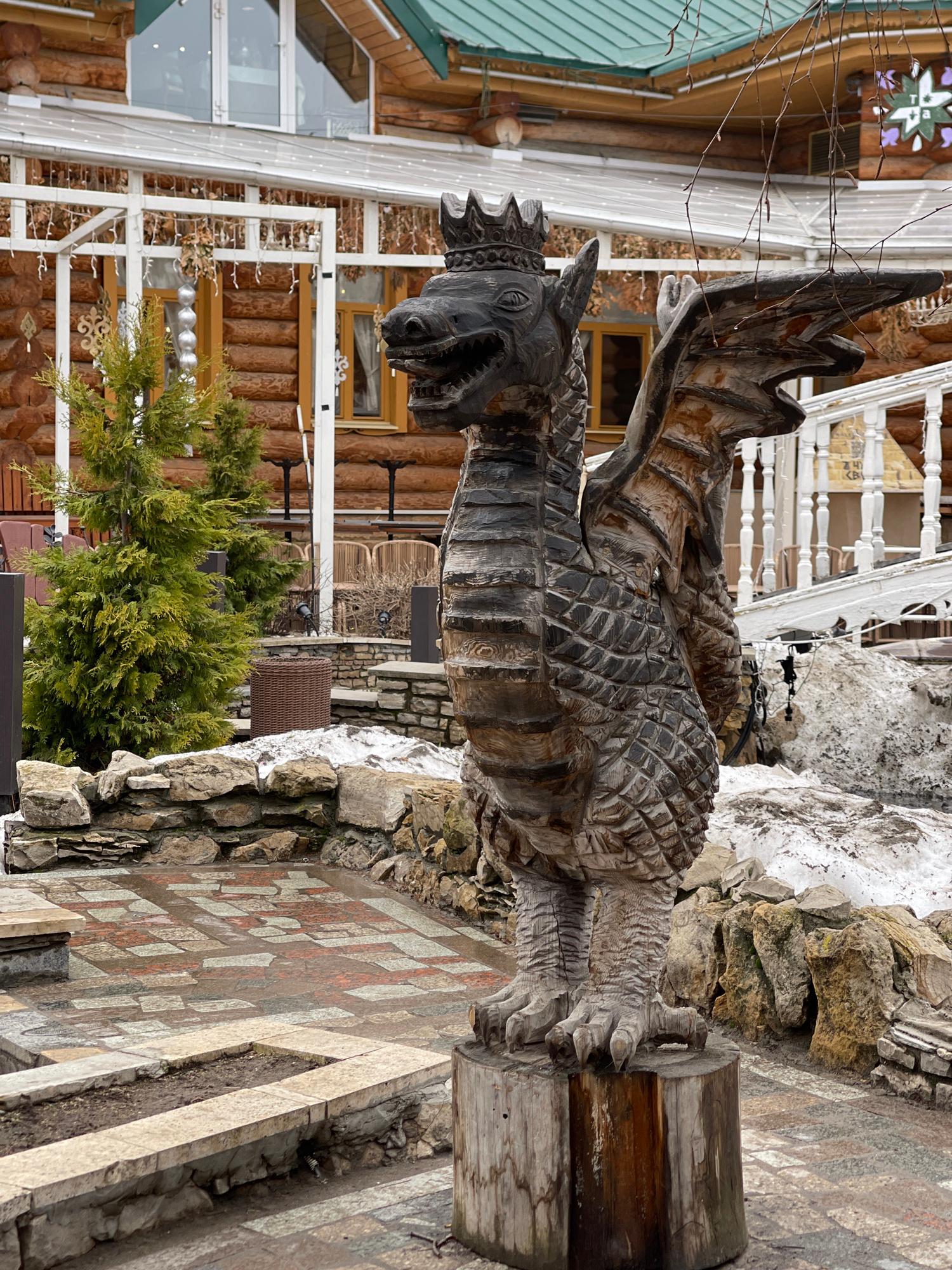 The image shows a wooden statue of a dragon in Kazan, Russia. The statue is detailed, with scales, wings, and a crown. It stands on a wooden post surrounded by rocks. In the background, there is a bui…read more