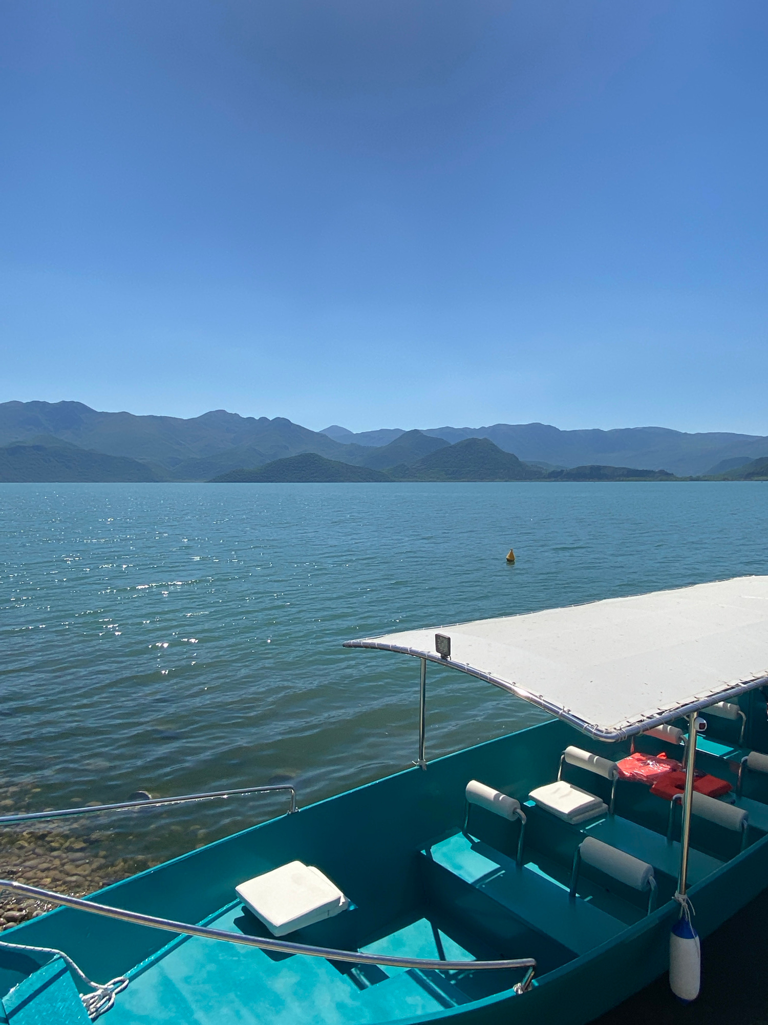 The image depicts a boat on Lake Skadar, near Vranjina, Montenegro. The foreground shows the teal and white side of a boat with white bumpers and an orange life vest. The water reflects sunlight. In t…read more