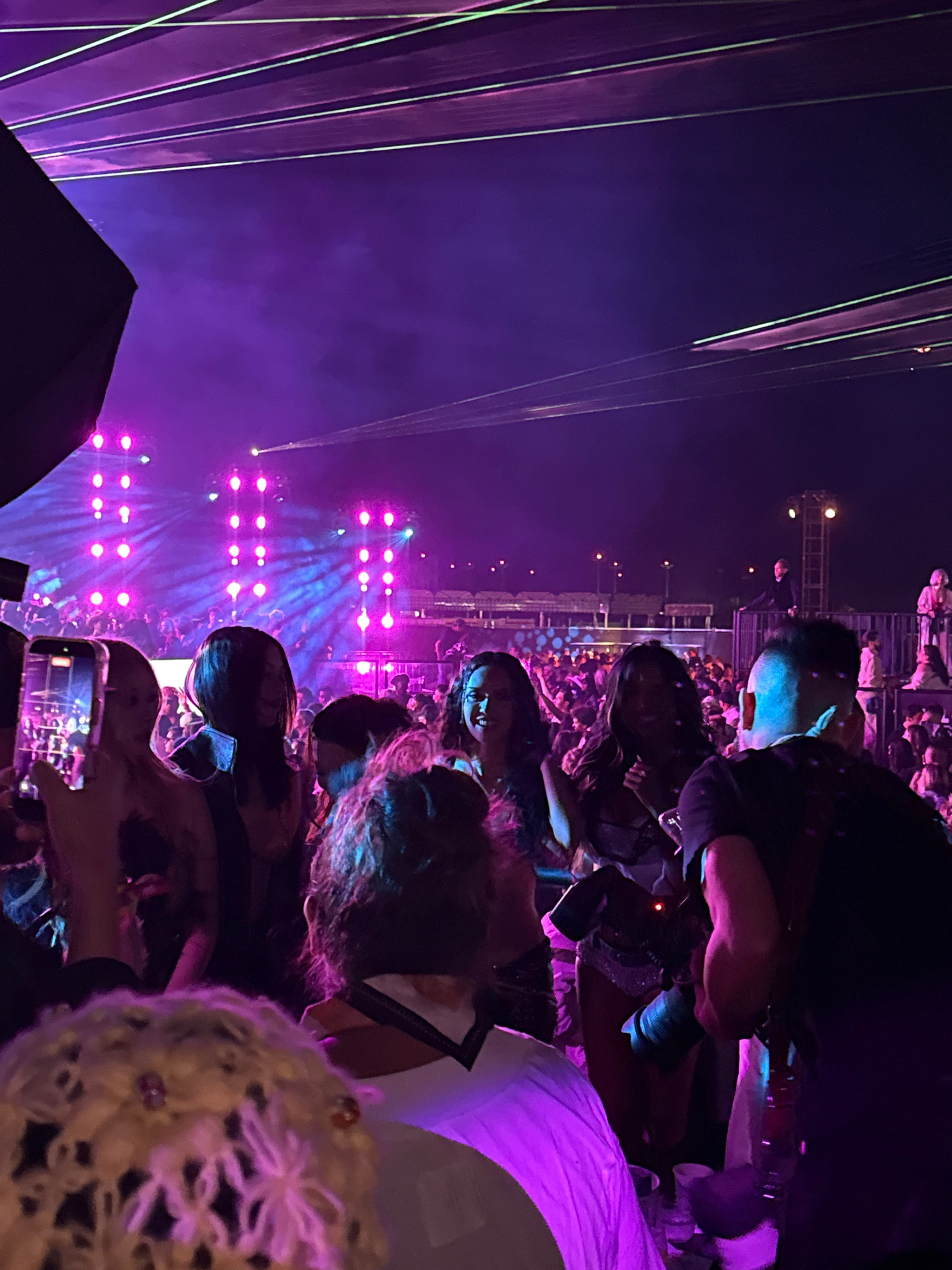 The image depicts a live concert setting, likely at night, in Thermal, United States of America, judging by the context. The foreground shows concert attendees, some with cameras, capturing the event.…read more