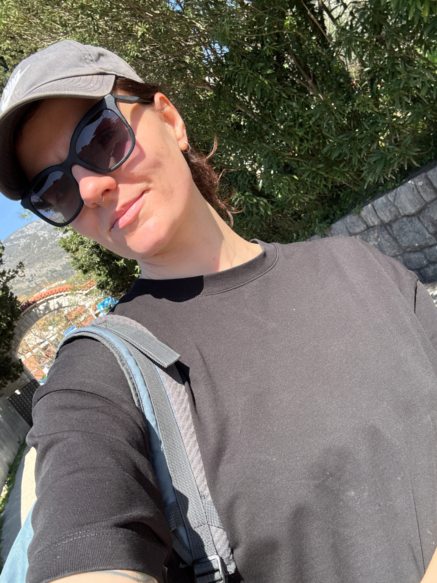 A person wearing a black t-shirt, a grey cap, and black sunglasses is posing for a picture outdoors. The background shows greenery and a view, possibly taken in Pržno, Montenegro, as there is an image…read more