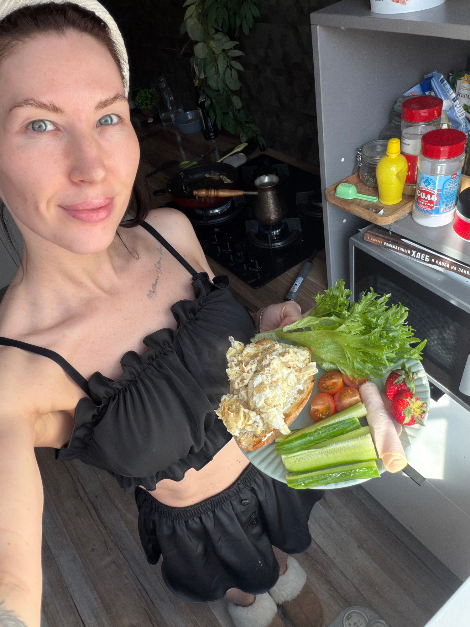 A woman is taking a selfie while holding a plate of food. The plate contains lettuce, strawberries, ham, sliced tomatoes, sliced cucumbers, and a sandwich with a white filling. The woman is wearing a…read more