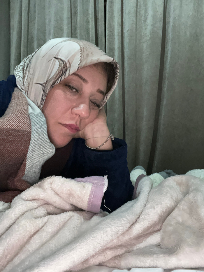 A woman with light skin is resting, her head covered in a patterned scarf. She's wrapped in a maroon and grey blanket, a blue garment peeking out from beneath. A silver bracelet adorns her wrist. Fluf…read more