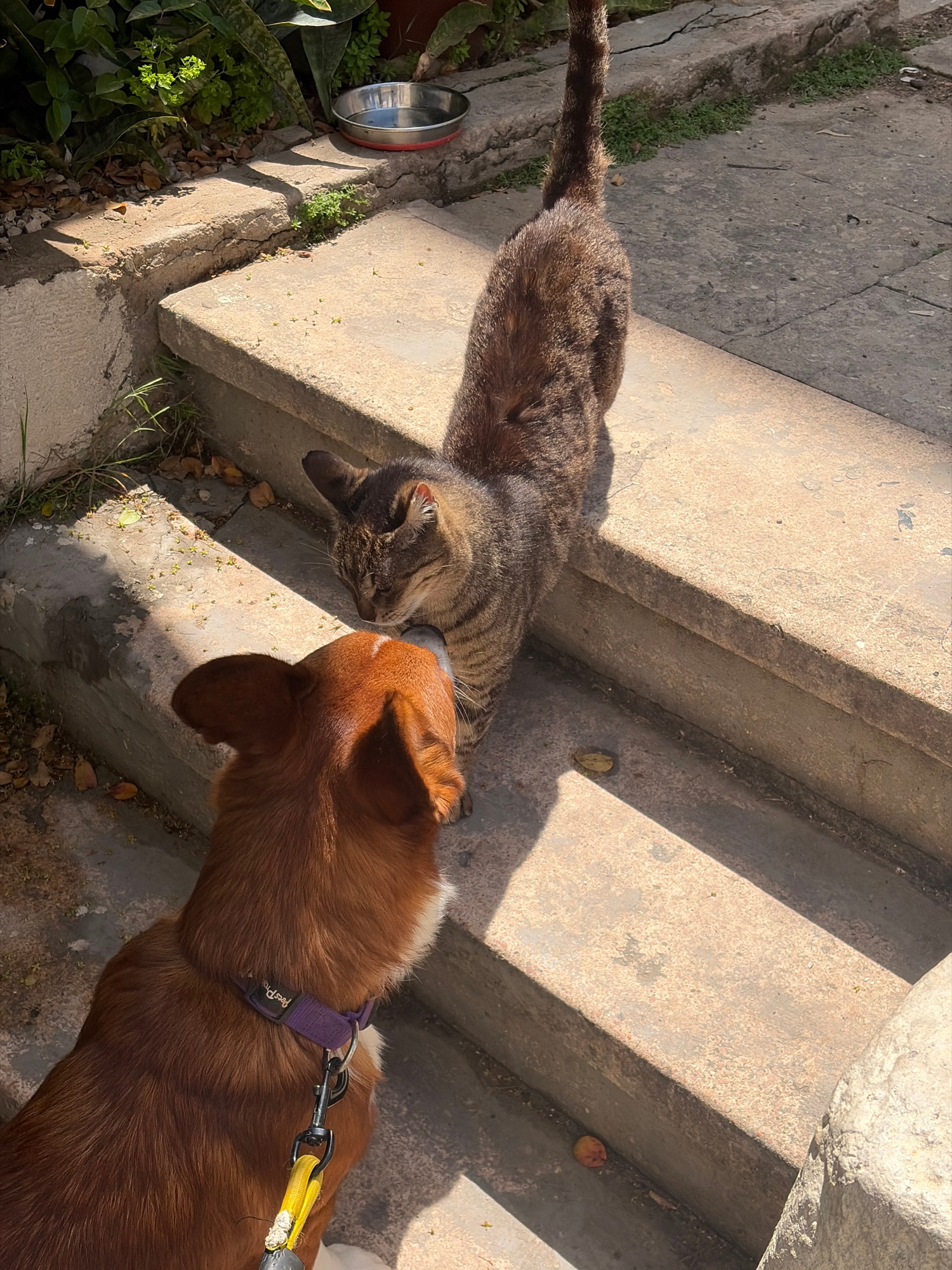 A tabby cat lies on a set of concrete stairs, its head near the edge. A brown dog with a white chest and purple collar approaches, its nose near the cat's face. A metal bowl sits on the ground near pl…read more