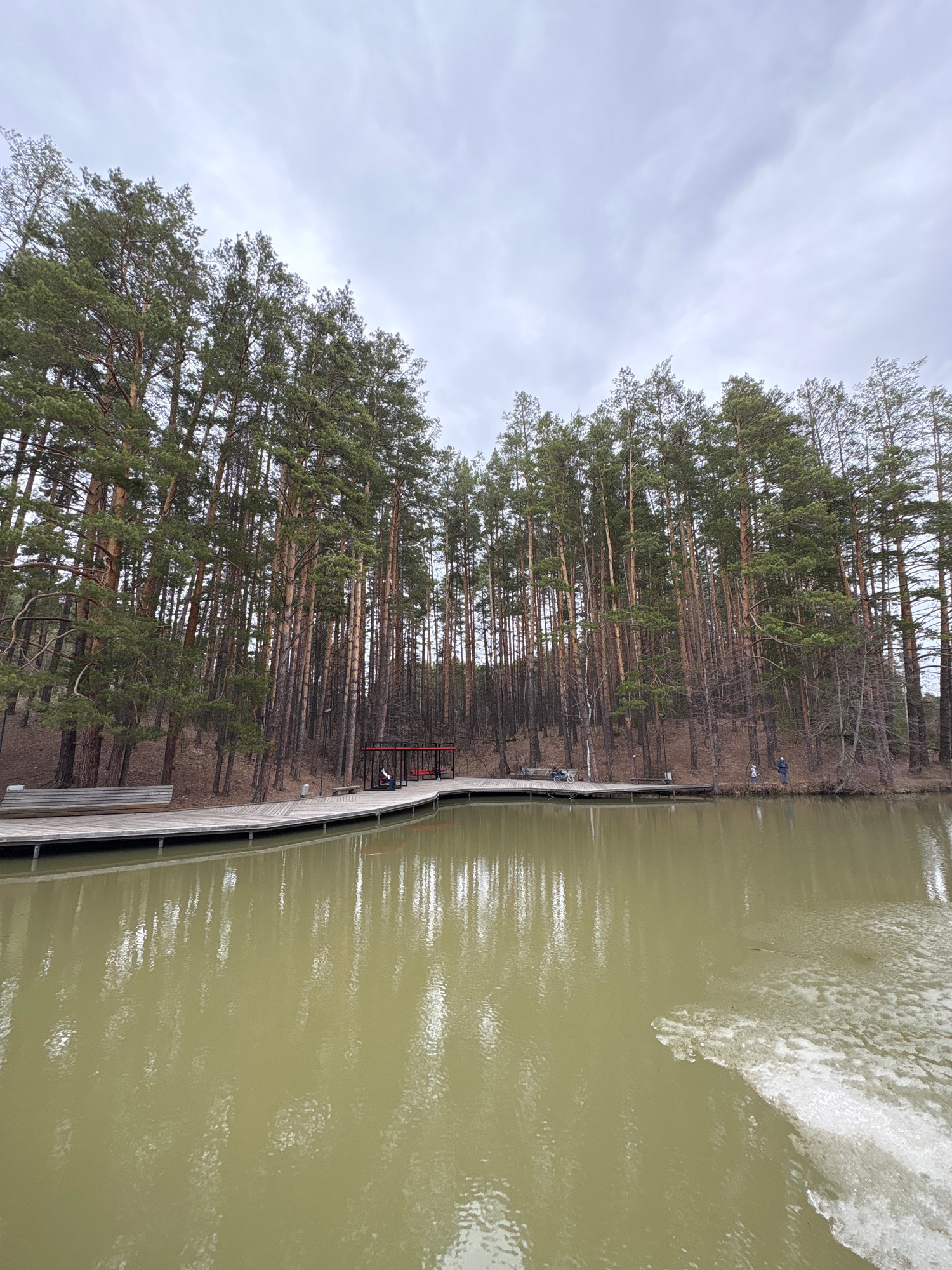 The image shows a view of a waterfront area in Neftekamsk, Russia. A dense line of tall pine trees is to the left, next to a wooden boardwalk or path. The path runs along the edge of a body of water,…read more