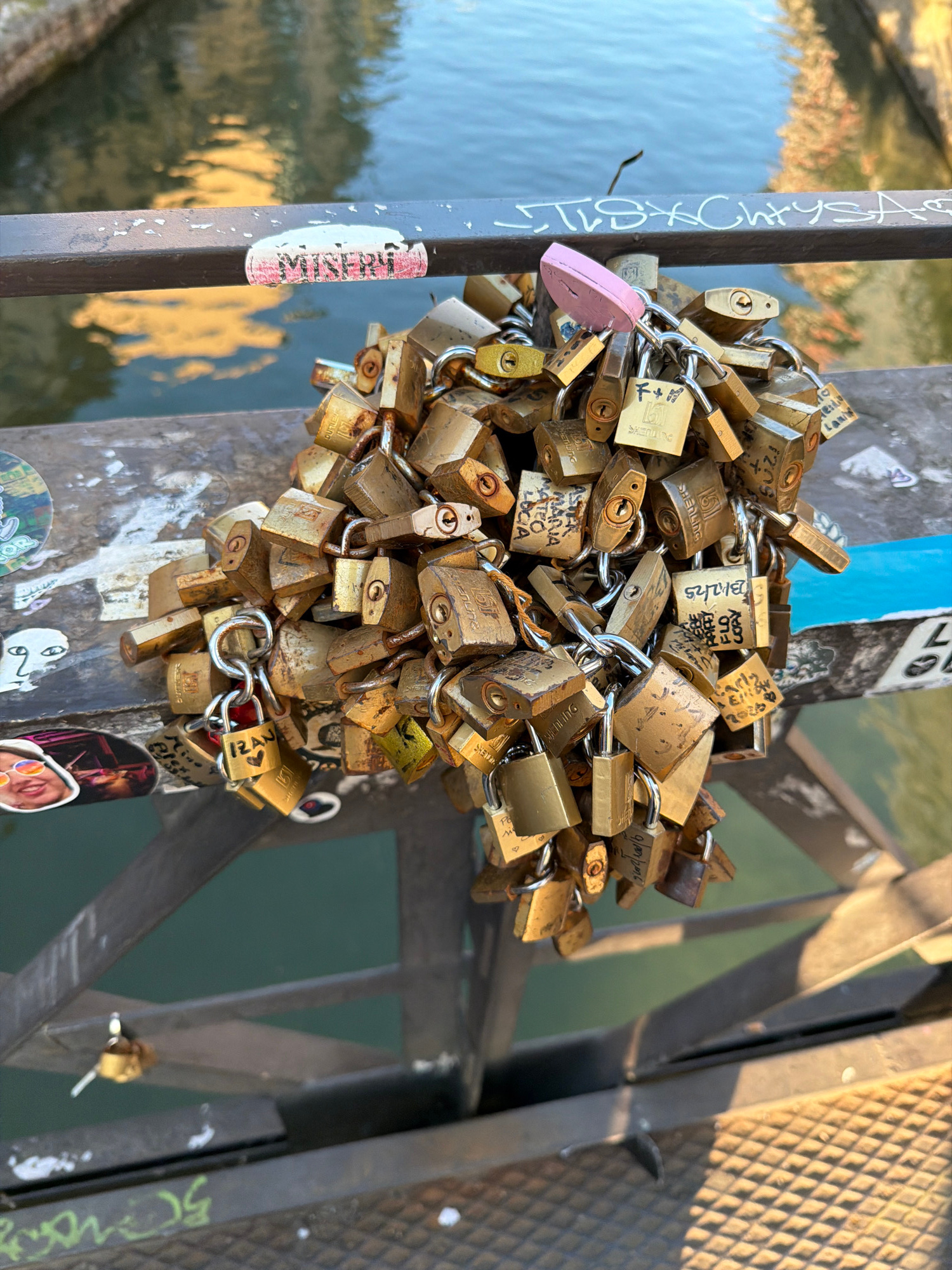 The image depicts a dense cluster of love locks attached to a metal support structure. The locks are primarily brass-colored, with one pink lock visible among them. Many locks have inscriptions, names…read more