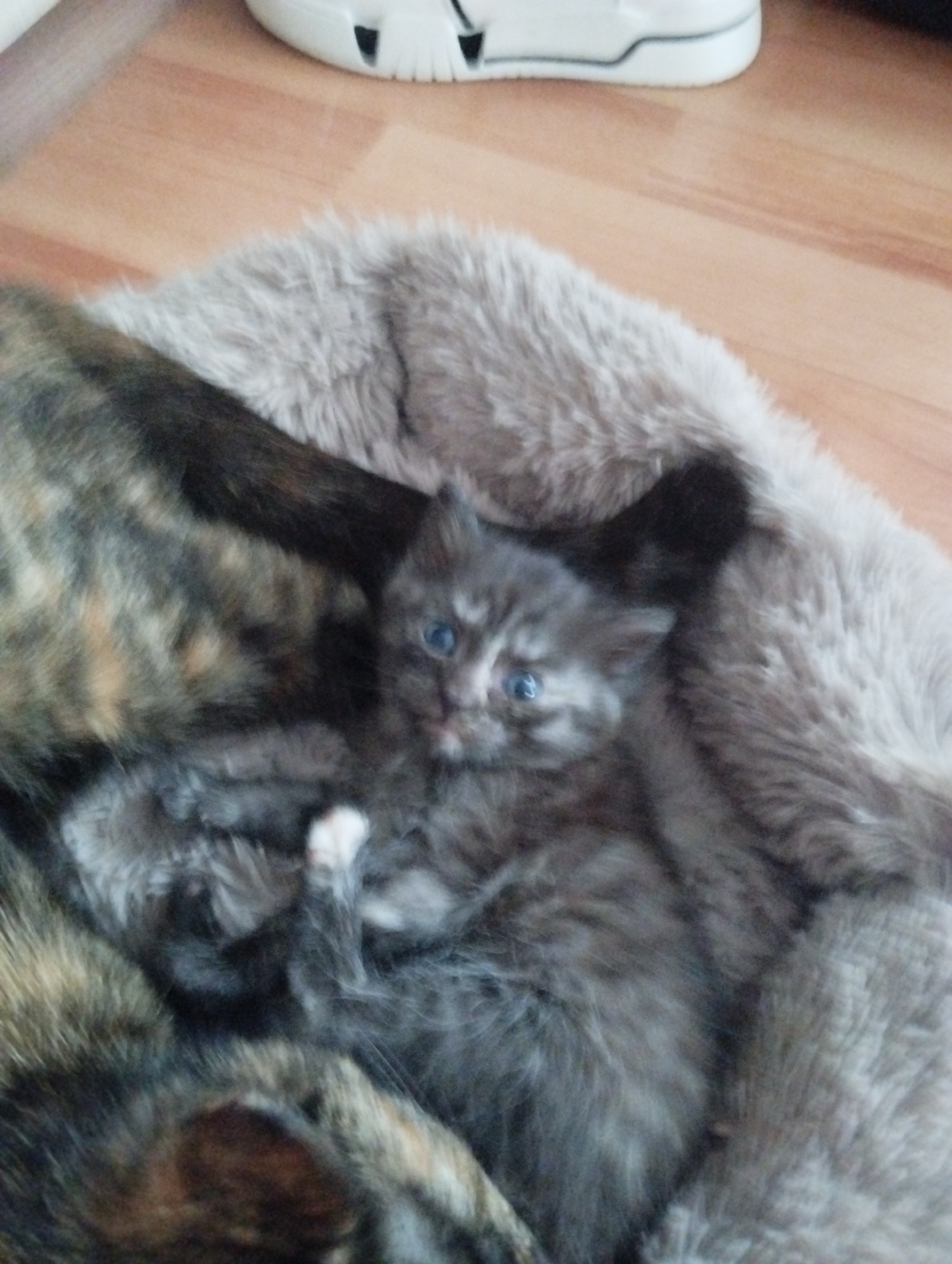 A kitten with gray fur and blue eyes is nestled in the fur of a tortoiseshell cat. A light brown fur rug is beneath the cats, and a white shoe is partially visible in the upper portion of the frame. The location is in the city of Krasnogorskoye, Russia. | Open Wire