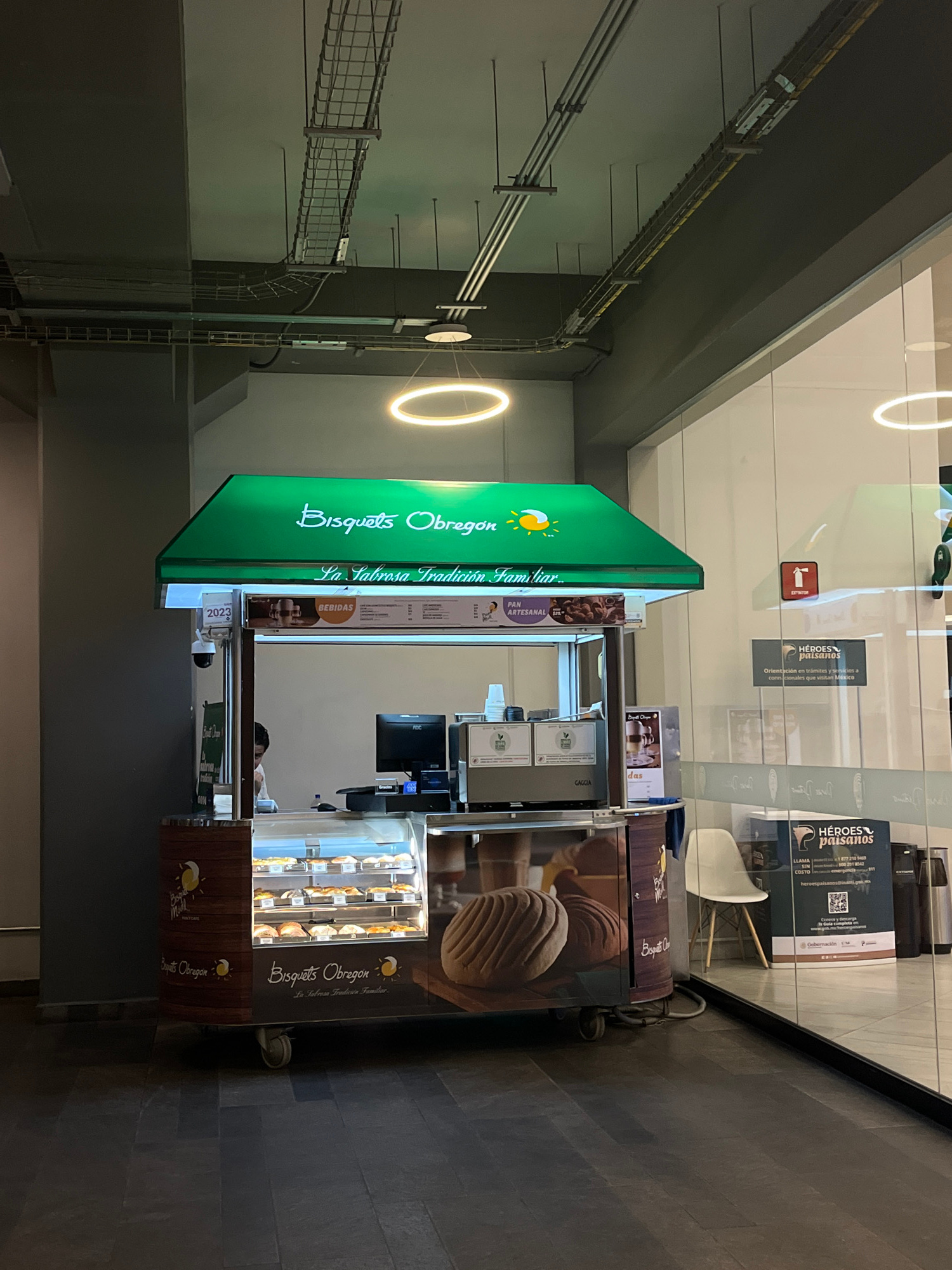A brightly lit food kiosk stands inside a modern building with polished floors. The kiosk, labeled "Bisquets Obregon," features a green awning with the brand name and a tagline in Spanish. Inside the…read more