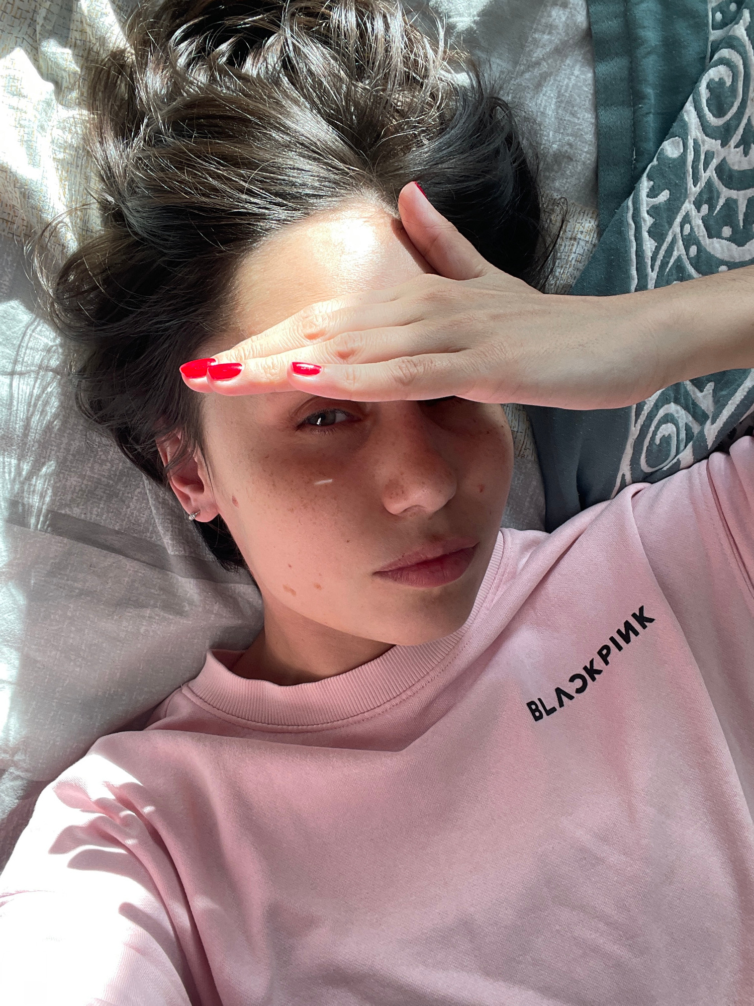 A woman lies on a bed, partially covering her face with her hand. She has dark hair and fair skin with freckles. Her fingernails are painted red. She wears a light pink sweatshirt with the word "BLACK…read more