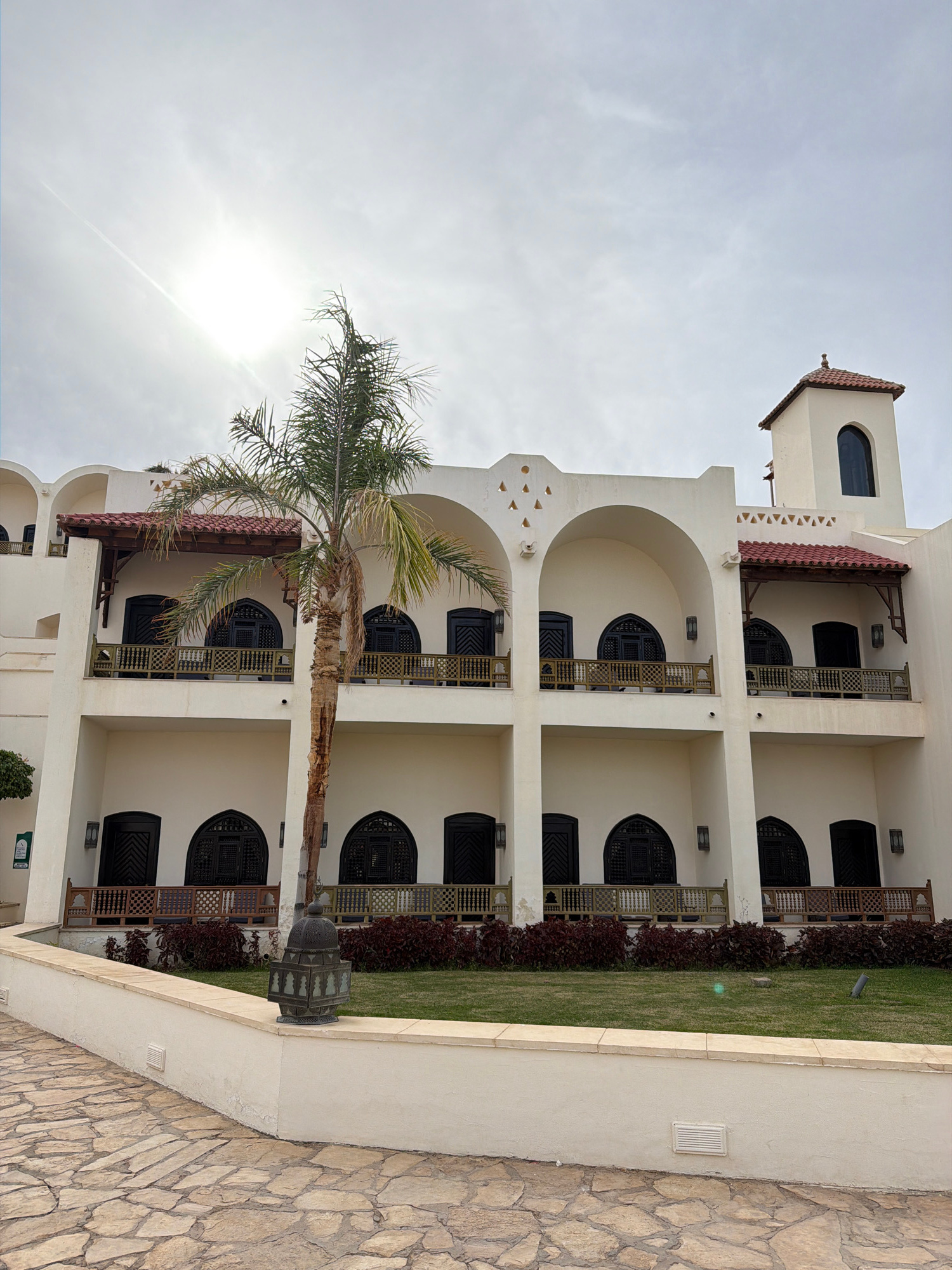 The image shows a multi-story building with white walls and arched windows/balconies. The architectural style appears to be Middle Eastern or Mediterranean, with red tile roofing on some sections. The…read more