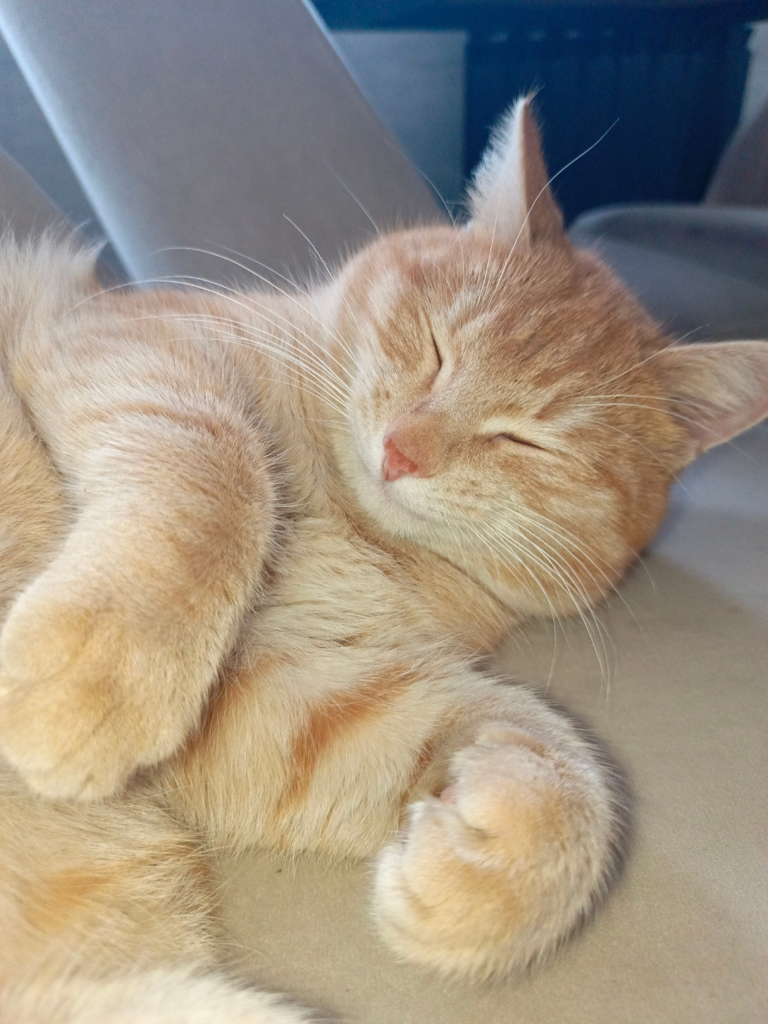 A close-up, high-angle shot shows a sleeping orange tabby kitten. The kitten lies curled on a light beige surface, possibly a cushion or piece of furniture. Its eyes are closed, and the paws are tucke…read more