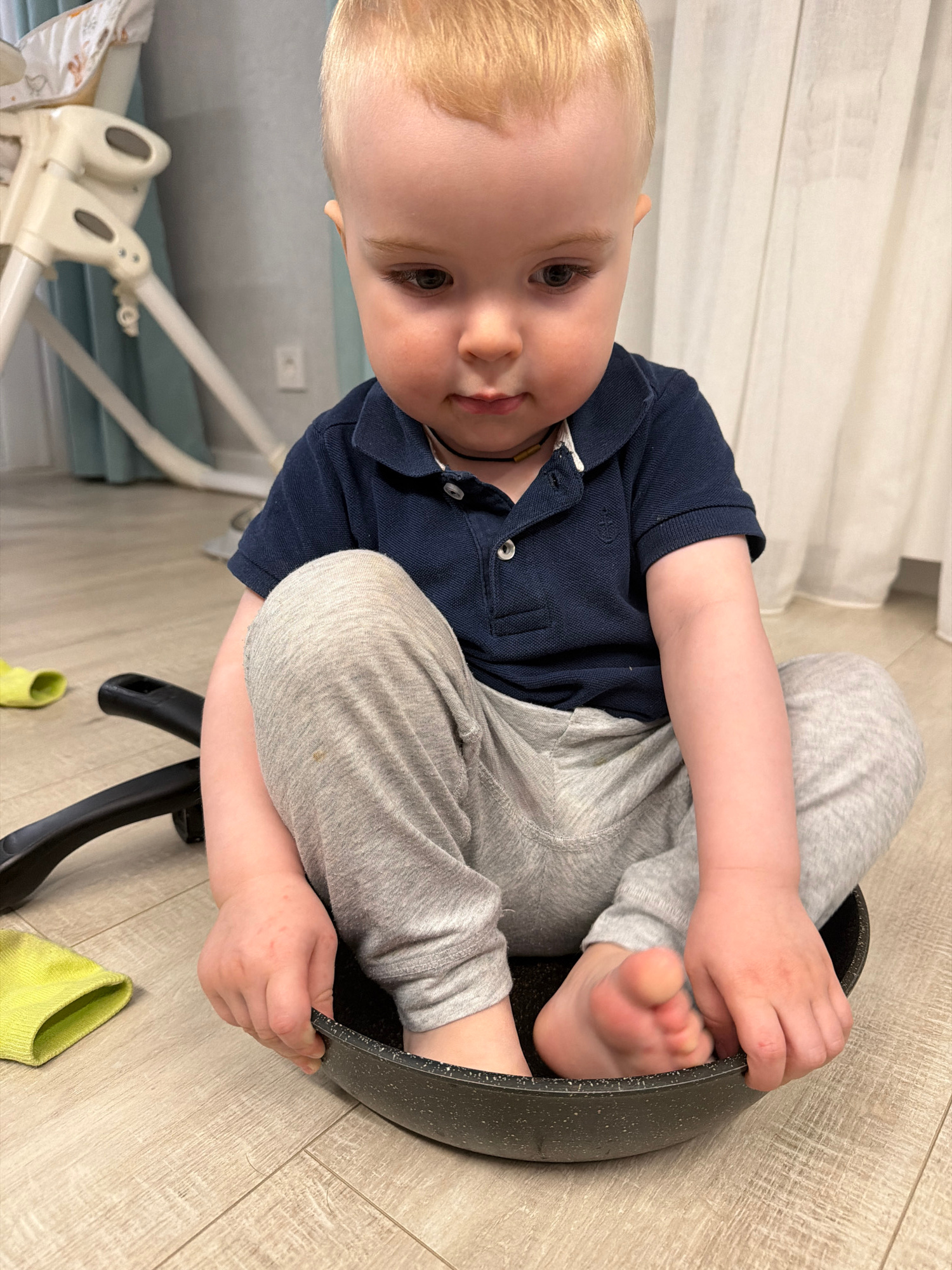 A toddler with light blonde hair and fair skin is sitting inside a large, dark-colored frying pan. The child is wearing a navy blue polo shirt and grey sweatpants. The pan rests on a black chair. The…read more