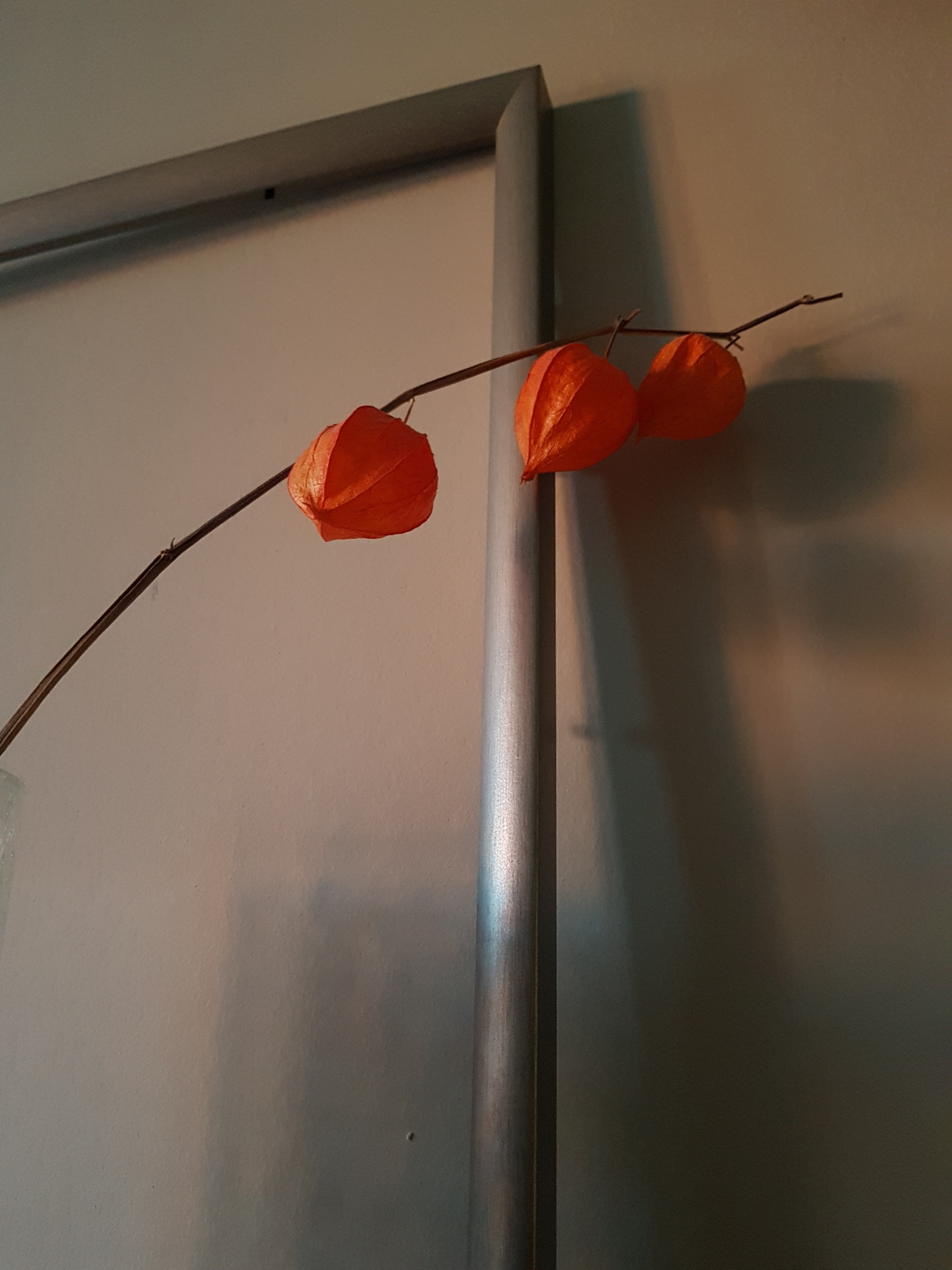 The image shows a dried branch with three orange physalis lanterns hanging on it. The branch is positioned against a neutral-toned wall and a silver-framed object, possibly a piece of furniture or a p…read more