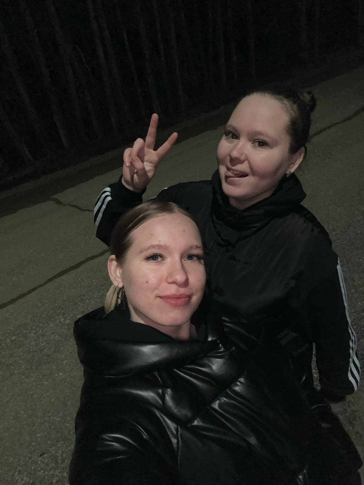 Two women are on the ground outdoors at night. One is lying on her back, wearing a black puffy jacket. The other woman is partially on top of her, wearing a black Adidas jacket with white stripes on t…read more