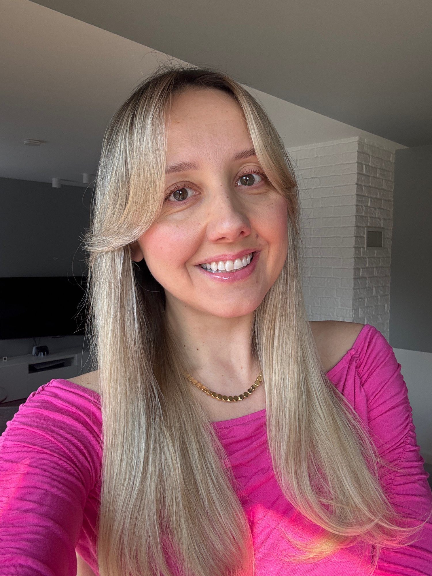 A light-skinned woman with long, blonde hair and a gold necklace is smiling and looking directly at the camera. She is wearing a bright pink, textured shirt. The background includes a light gray wall,…read more