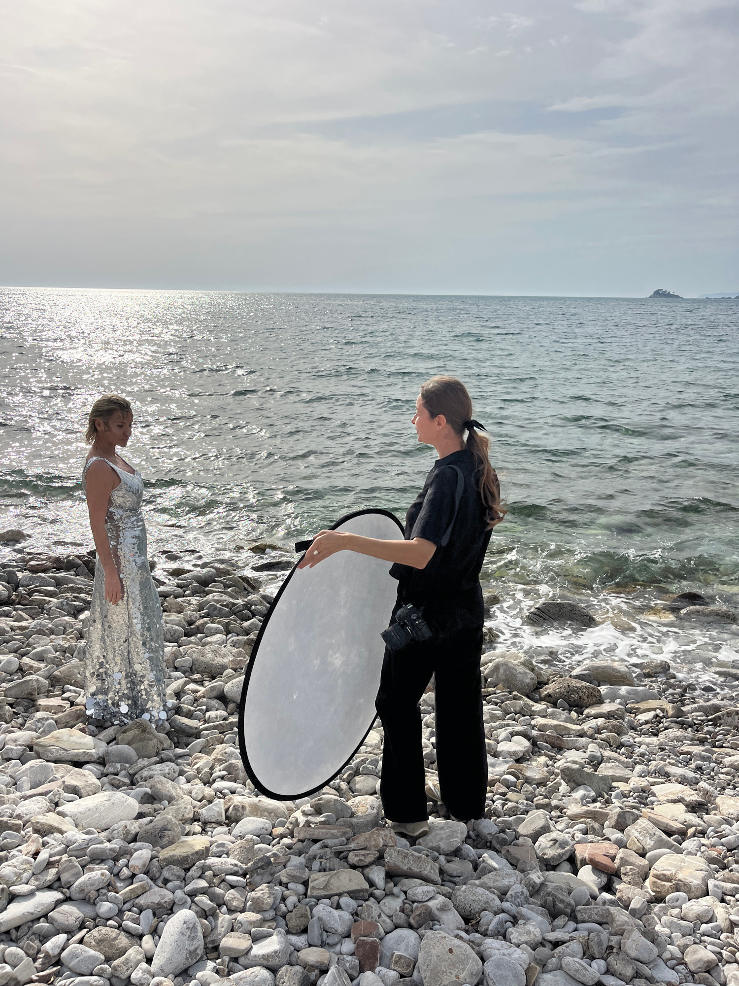 A professional photoshoot is underway on a pebble beach in Buljarica, Montenegro. The image features two women: a model and a photographer or assistant. The model stands in the shallow, clear water,…read more