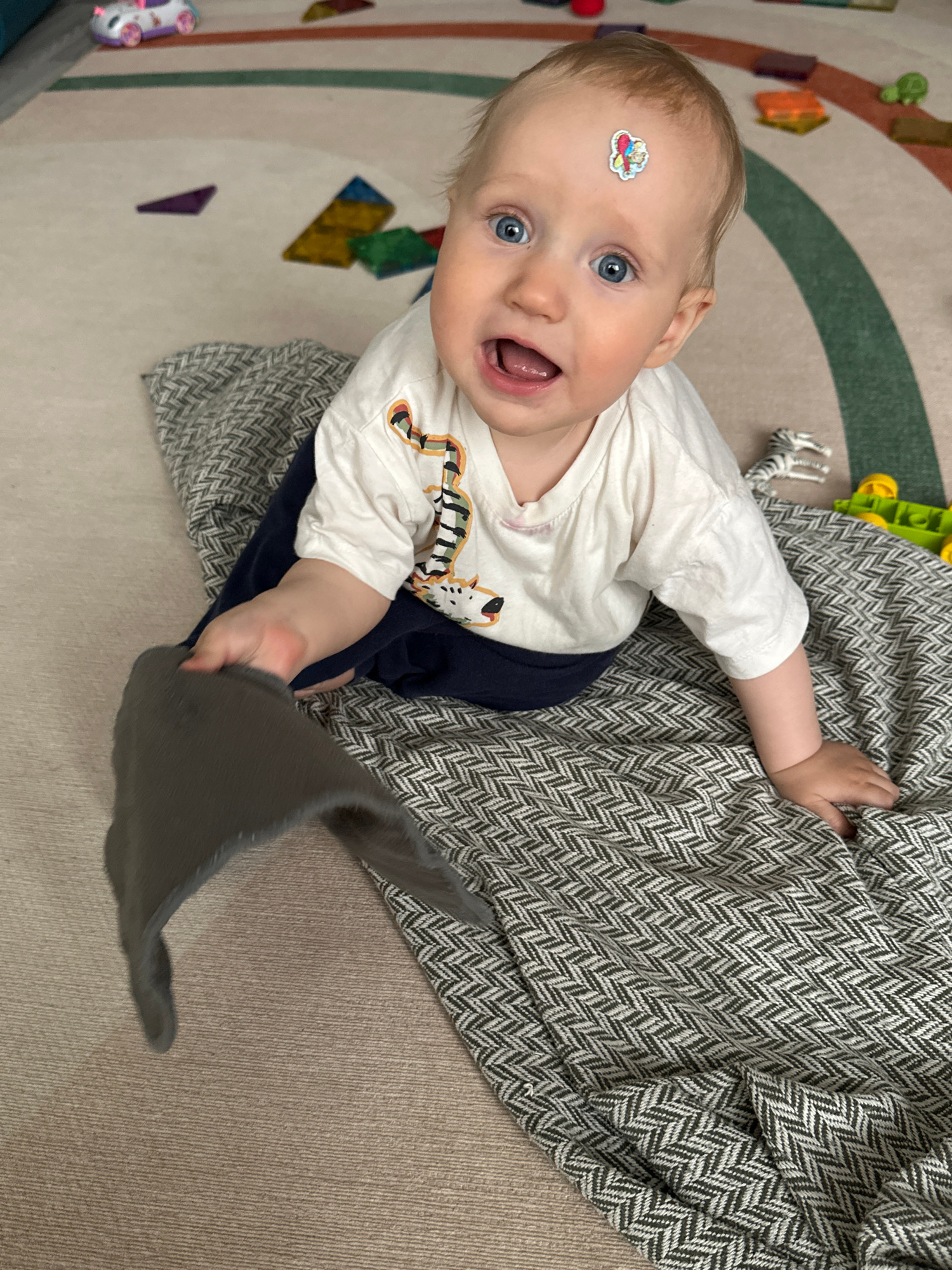 A cheerful baby with light hair and bright blue eyes lies on a patterned rug, looking directly up at the camera with an open-mouthed smile. A small, colorful sticker depicting a red airplane flying ov…read more