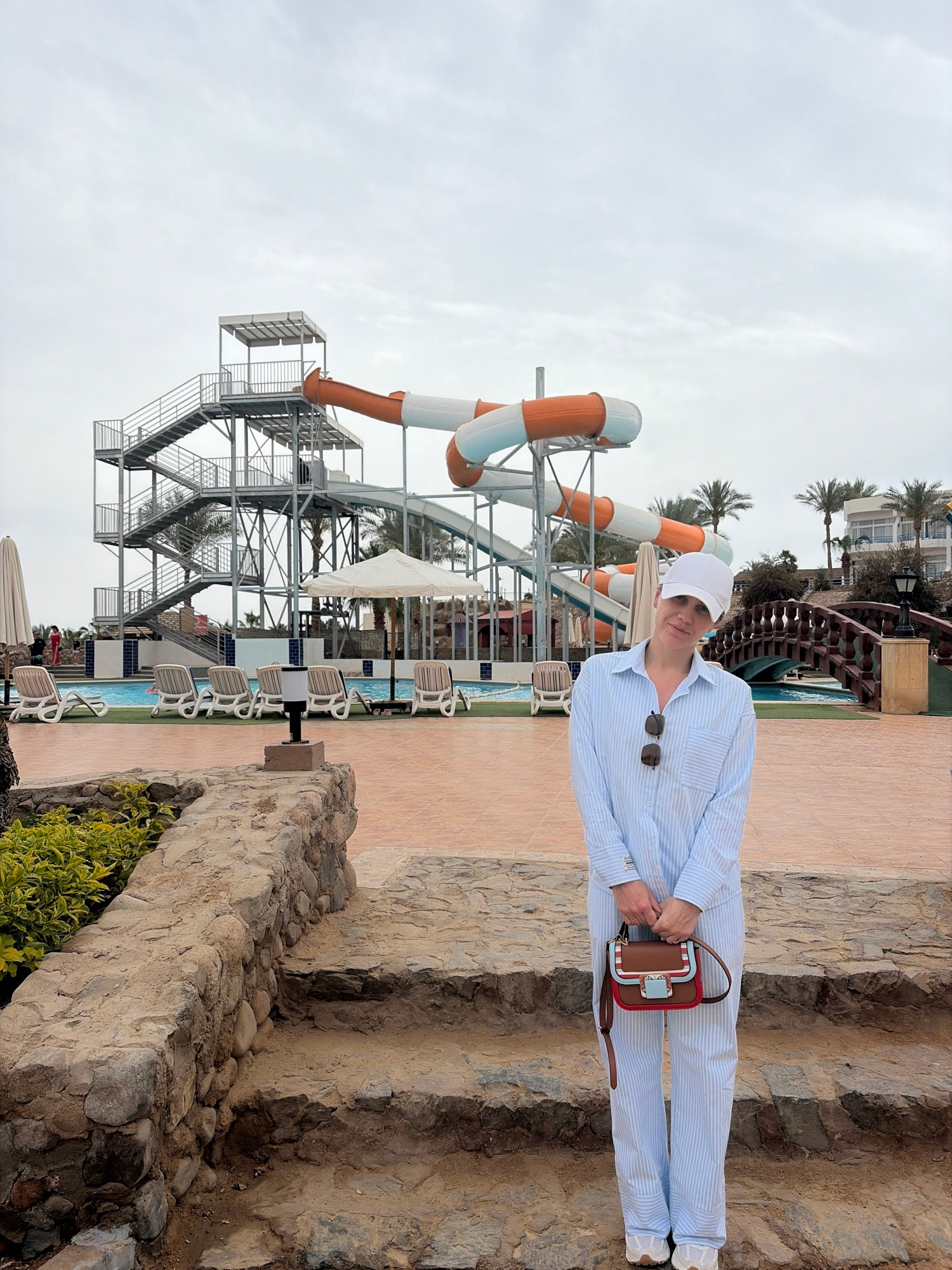 A full, medium shot shows a fair-skinned woman standing in front of a waterslide in Sharm El Sheikh, Egypt. She wears a light blue and white striped shirt, matching pants, a white baseball cap, and wh…read more