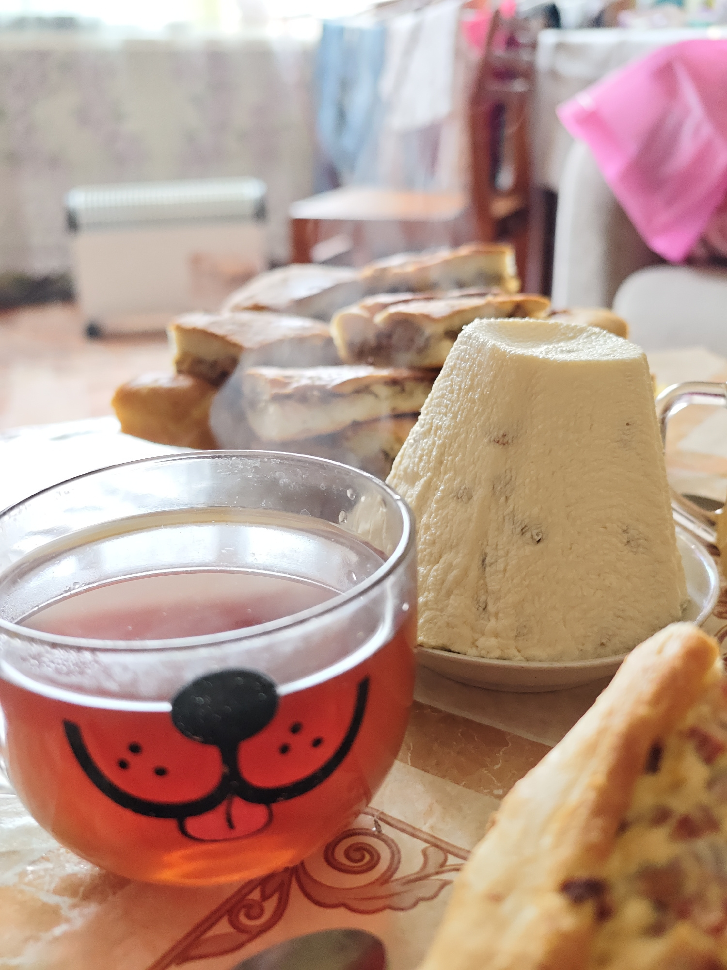 The image shows a table setting with various food items and a cup of tea. In the foreground, a clear glass cup with a cartoon dog face design contains tea. Next to it, on a plate, is a cone-shaped whi…read more