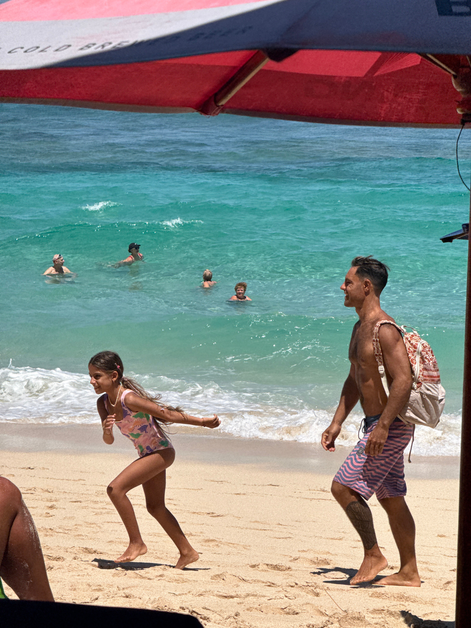 A photograph captures a beach scene, likely in Kuta Selatan, Indonesia, given the locale. The image is taken from a sheltered vantage point, perhaps under a canopy structure, with red and white colors…read more