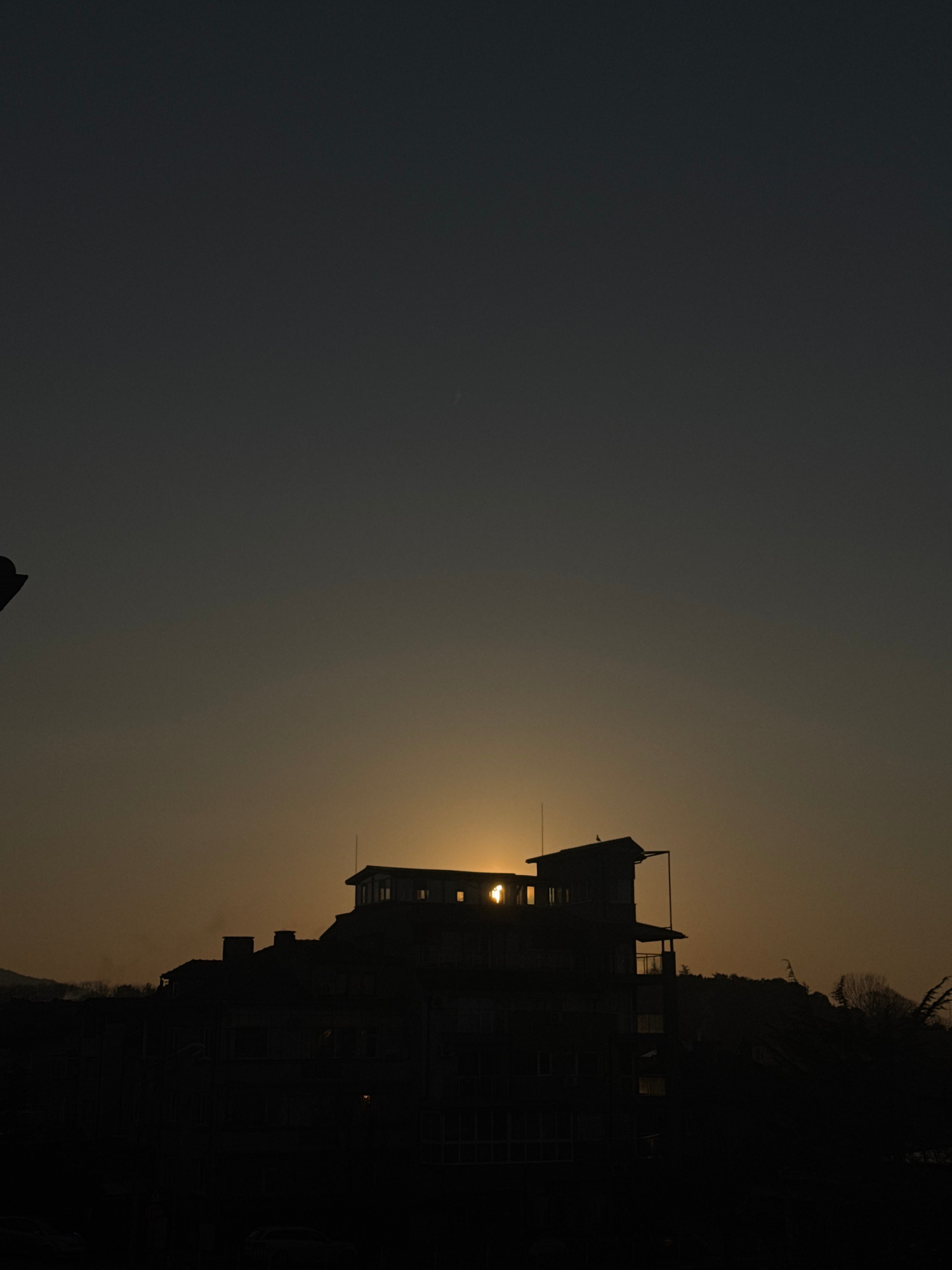 The image shows a silhouette of a building against a dusk or dawn sky. The building is multi-story with a rooftop deck, and the lighting suggests the sun is either rising or setting behind it. The bui…read more