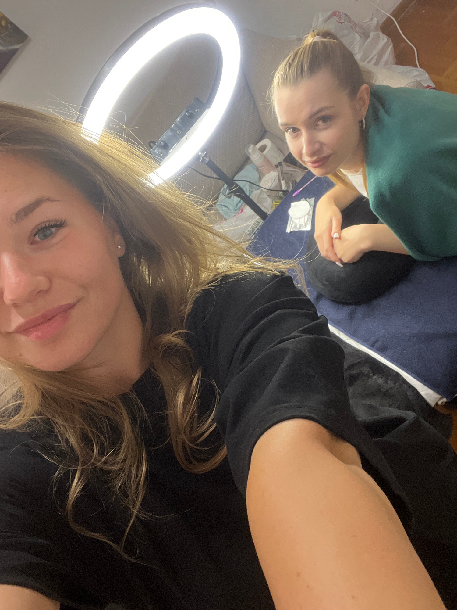 Two Caucasian females are in a room. One is in the foreground, wearing a black t-shirt, with shoulder-length blonde hair. Her head is oriented toward the lower part of the image. Above her is a ring l…read more