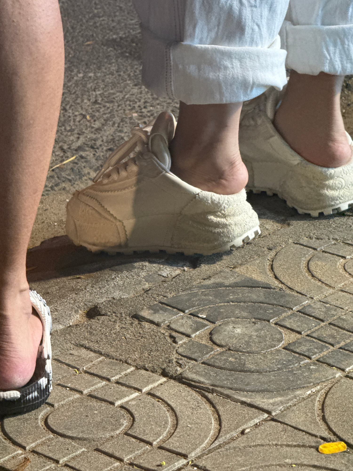 The image provides a top-down view of the lower legs and feet of at least two individuals standing or sitting on a decorative concrete pavement in Đà Nẵng, Vietnam. On the left side, a person wears l…read more