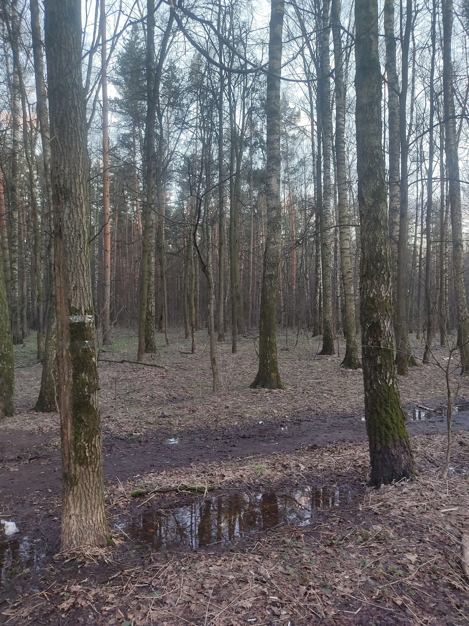 The image shows a forest scene in a park, likely in Moscow, Russia. The scene is composed of a row of closely planted trees with bare branches in the background, suggesting a season of late autumn or…read more