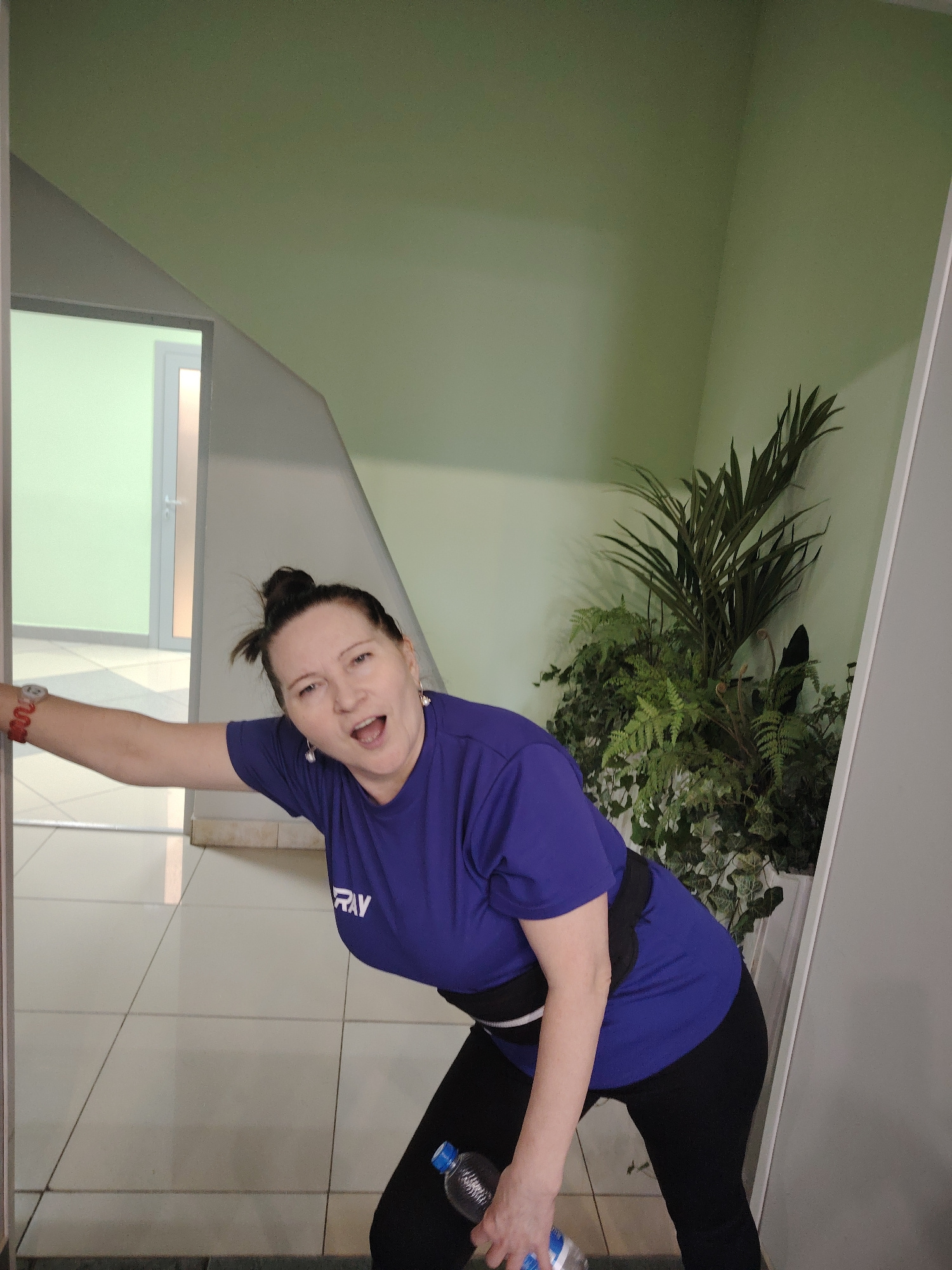 A middle-aged woman stands in a building in Sarapul, Russia, appearing in an entryway. She is wearing a dark blue shirt with white lettering and black leggings. A black and white belt encircles her wa…read more