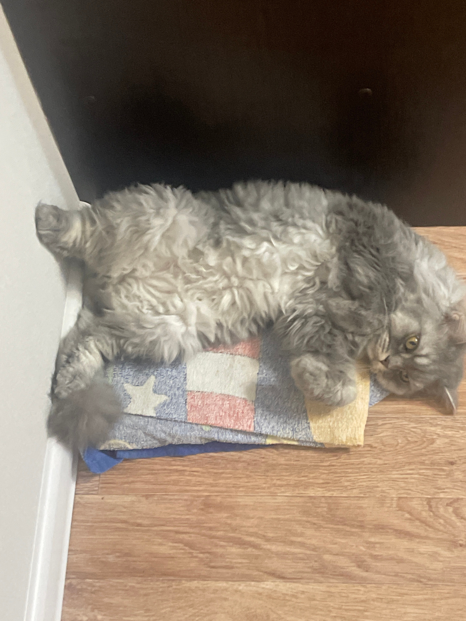 A gray, fluffy cat is standing on its hind legs while holding onto a folded, multi-colored towel. The cat has yellow eyes and a somewhat grumpy expression. It is positioned in the corner of a room, wi…read more