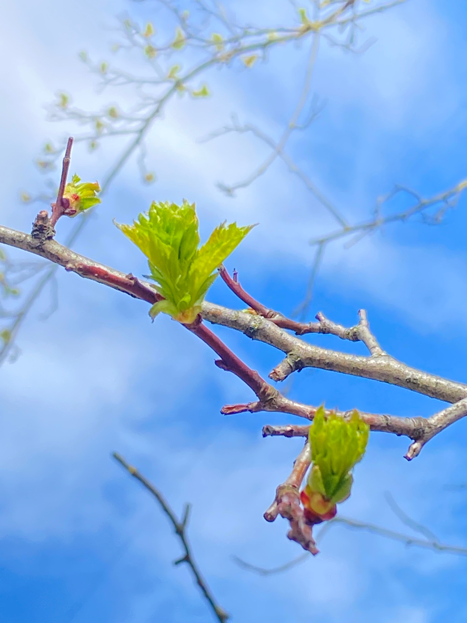 This close-up, upward-angle photograph captures the essence of early spring, showcasing nascent green leaves on tree branches against a clear blue sky. The primary subjects are several delicate, light…read more