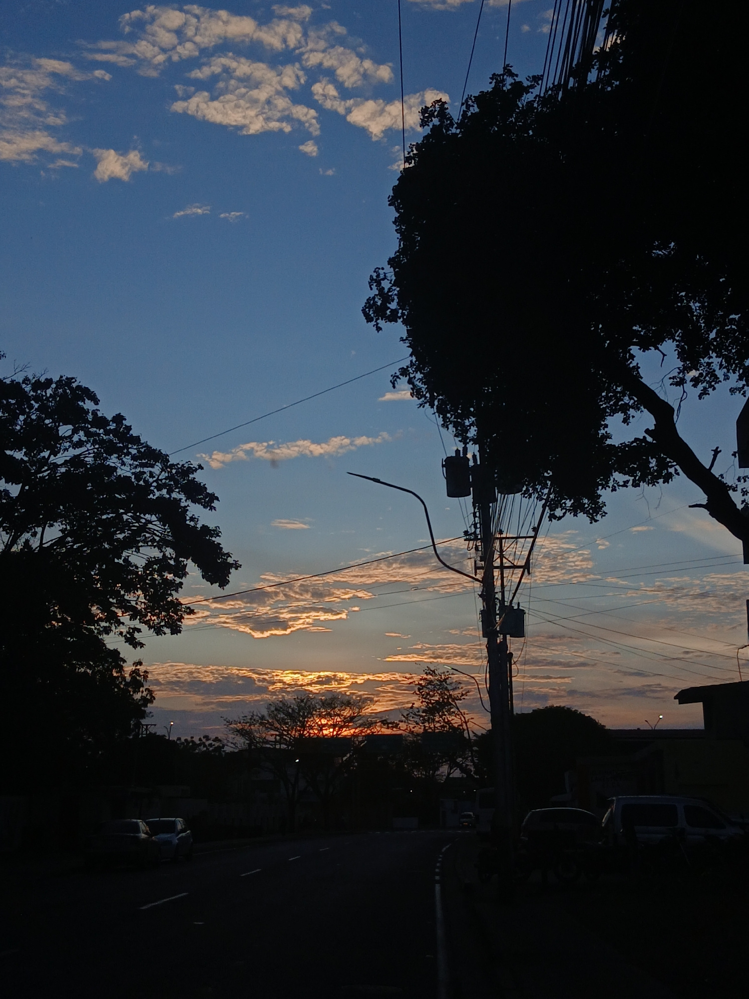 The image is an outdoor shot taken in Juan Griego, Venezuela, capturing a dusk or dawn scene. The sky is partially obscured by the silhouettes of trees in the foreground. The sky reveals a transition…read more