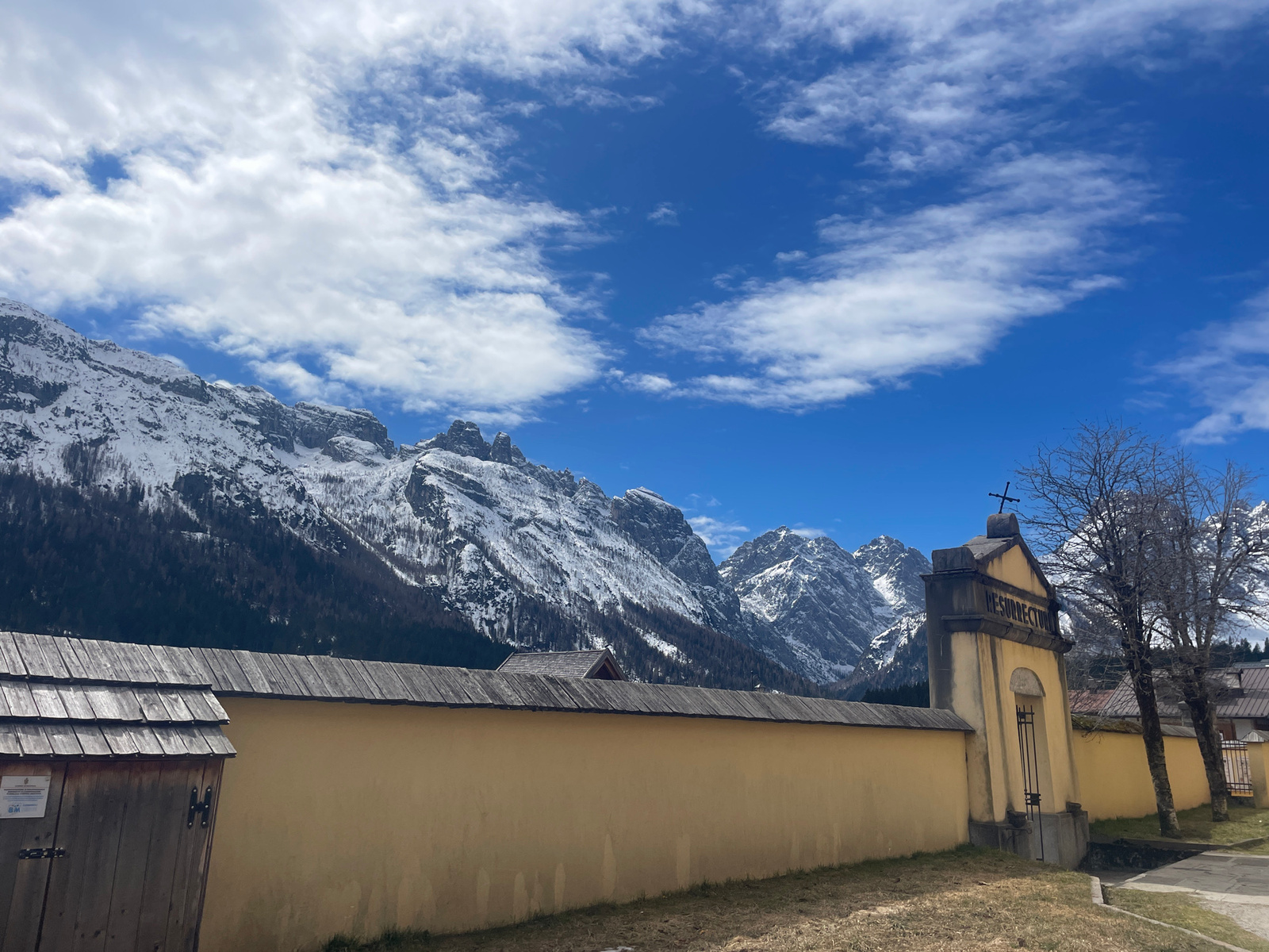 The image shows a street view in Sappada, Italy, featuring a low yellow wall with a wooden roof. To the left is a wooden gate with a peaked roof. Behind the wall is a mountainous landscape with snow-c…read more
