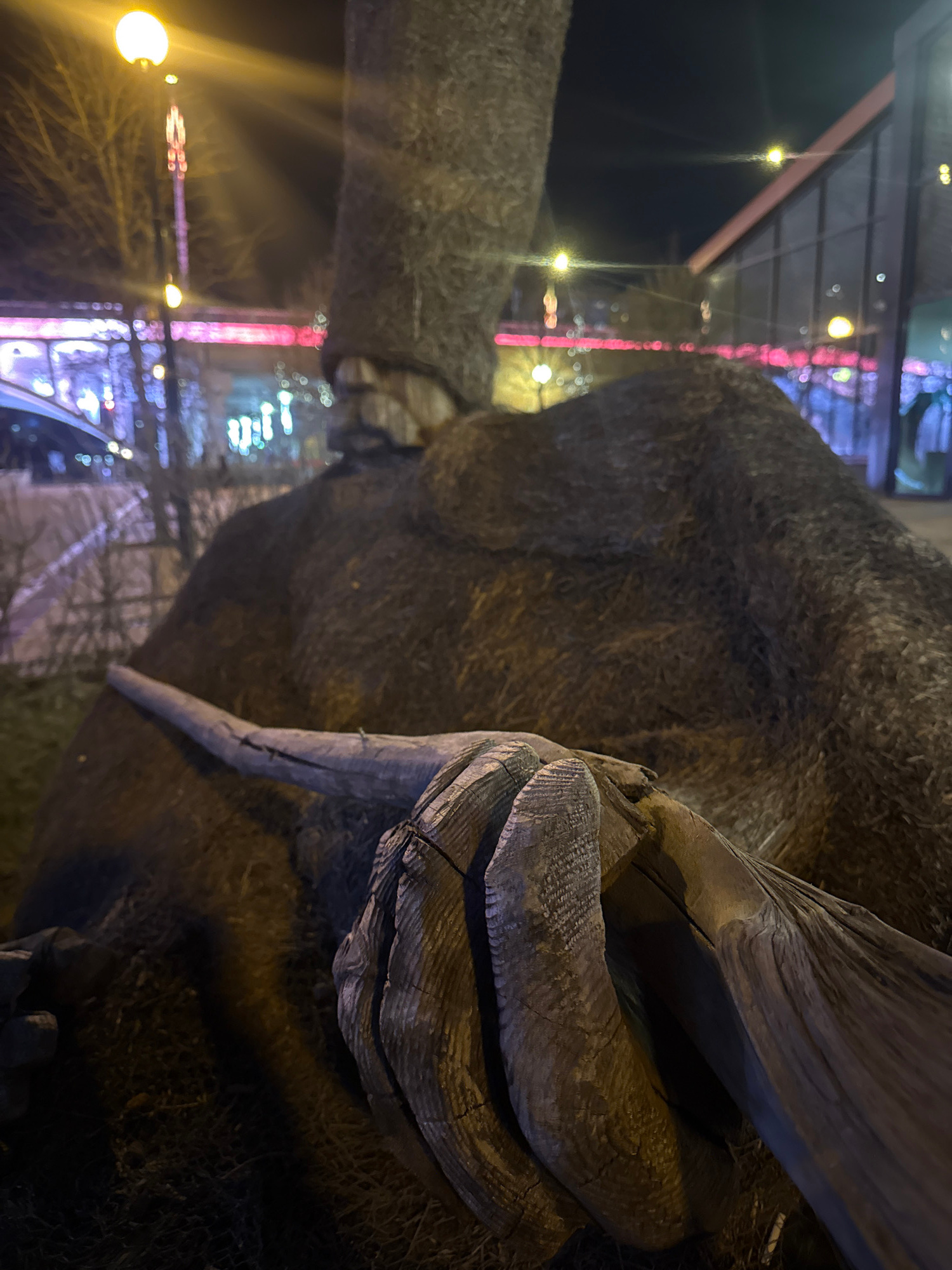 The image shows a close-up of a wooden sculpture of an elephant, potentially located outdoors. The sculpture appears to be made of rough-hewn wood, with visible textures and cracks. The elephant's tru…read more