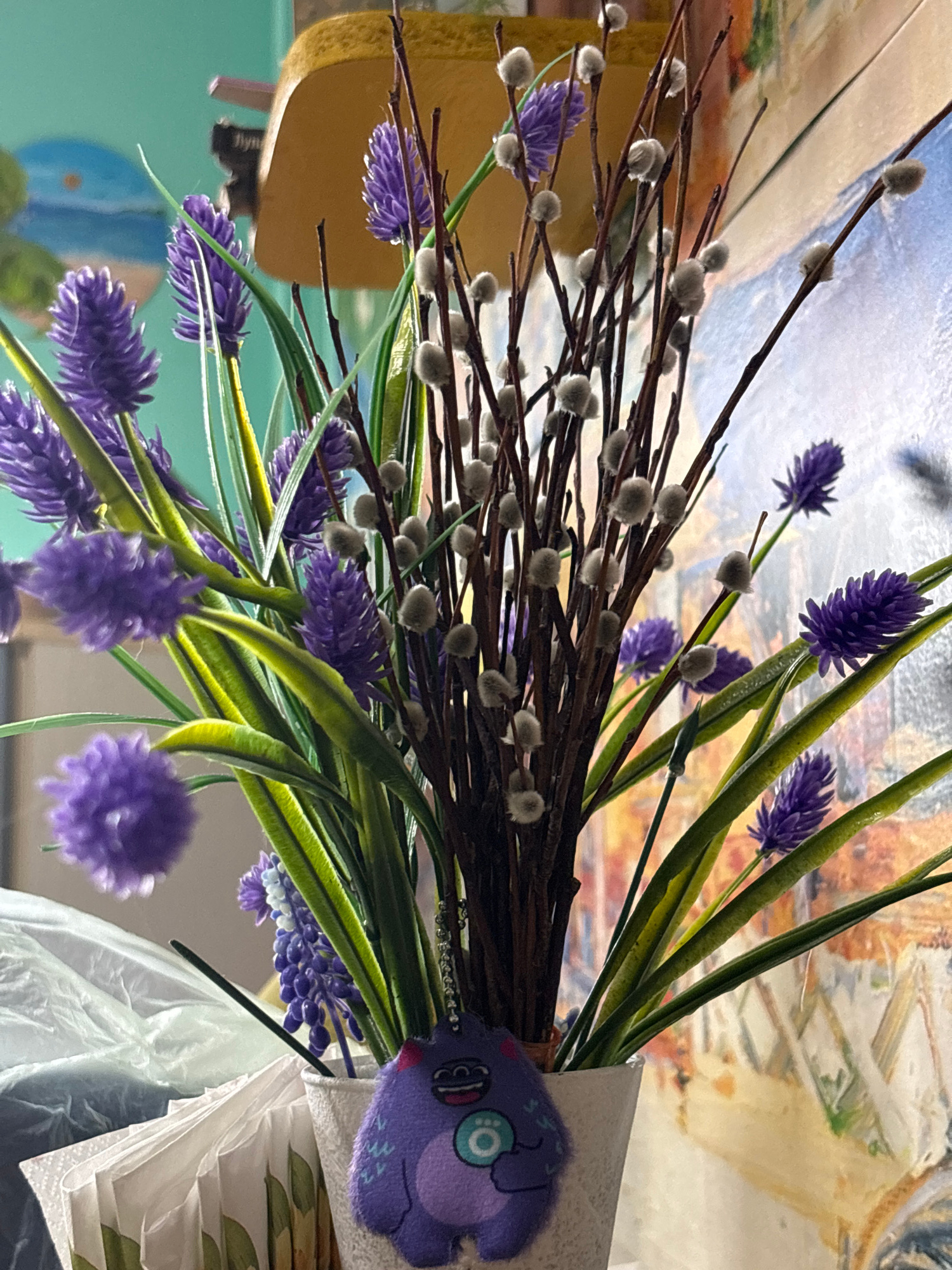 The image shows a bouquet of flowers consisting of pussy willow branches and purple hyacinth-like flowers. A small purple plush monster toy is tucked in among the flowers near the base. The flowers ar…read more