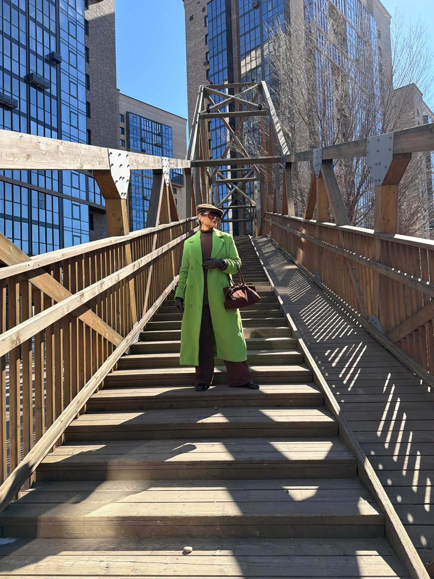 A photograph of a person wearing a bright green coat, brown pants, boots, gloves, and hat with a brown purse, appears to be standing on a wooden pedestrian overpass. The overpass features wooden slatsβ¦read more