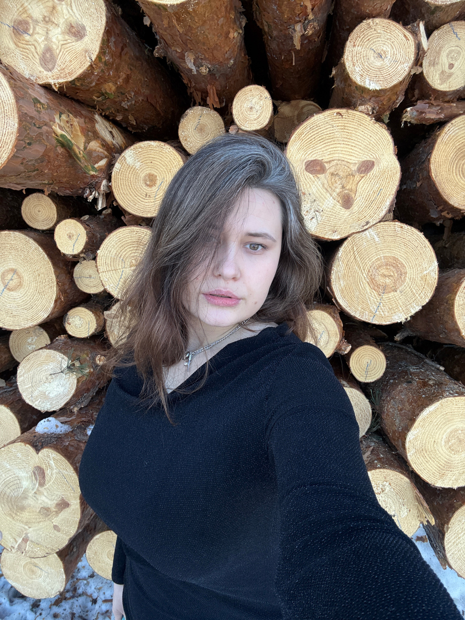 In the city of Noviy, Russia, a female individual is depicted in an outdoor, cold weather environment, positioned in front of a dense, stacked pile of numerous freshly cut logs. The logs, appearing to…read more
