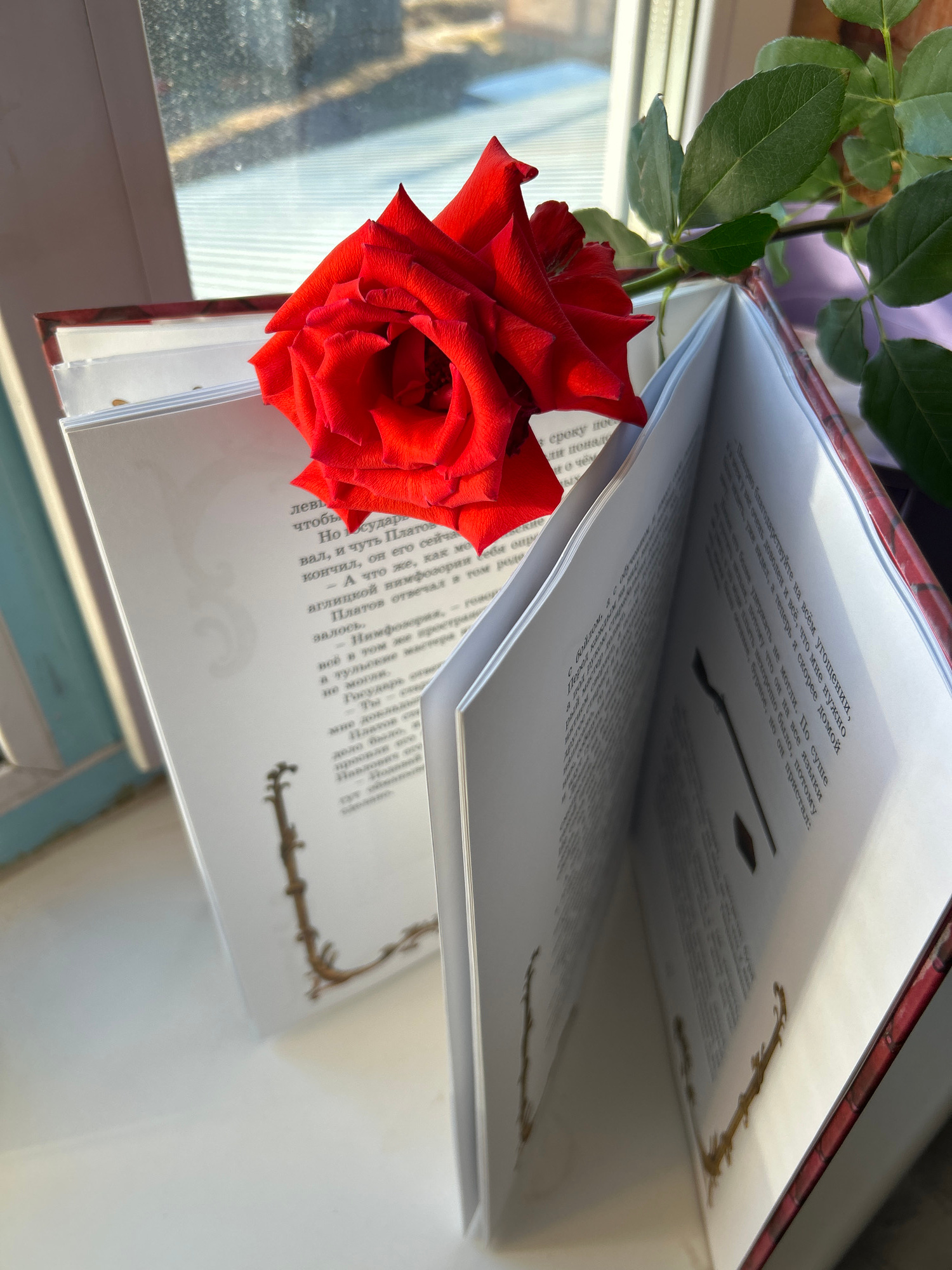 The image captures a serene still life featuring a vibrant red rose and an open book, likely positioned on a windowsill. The rose, with its fully bloomed, rich red petals, rests on the left side of th…read more