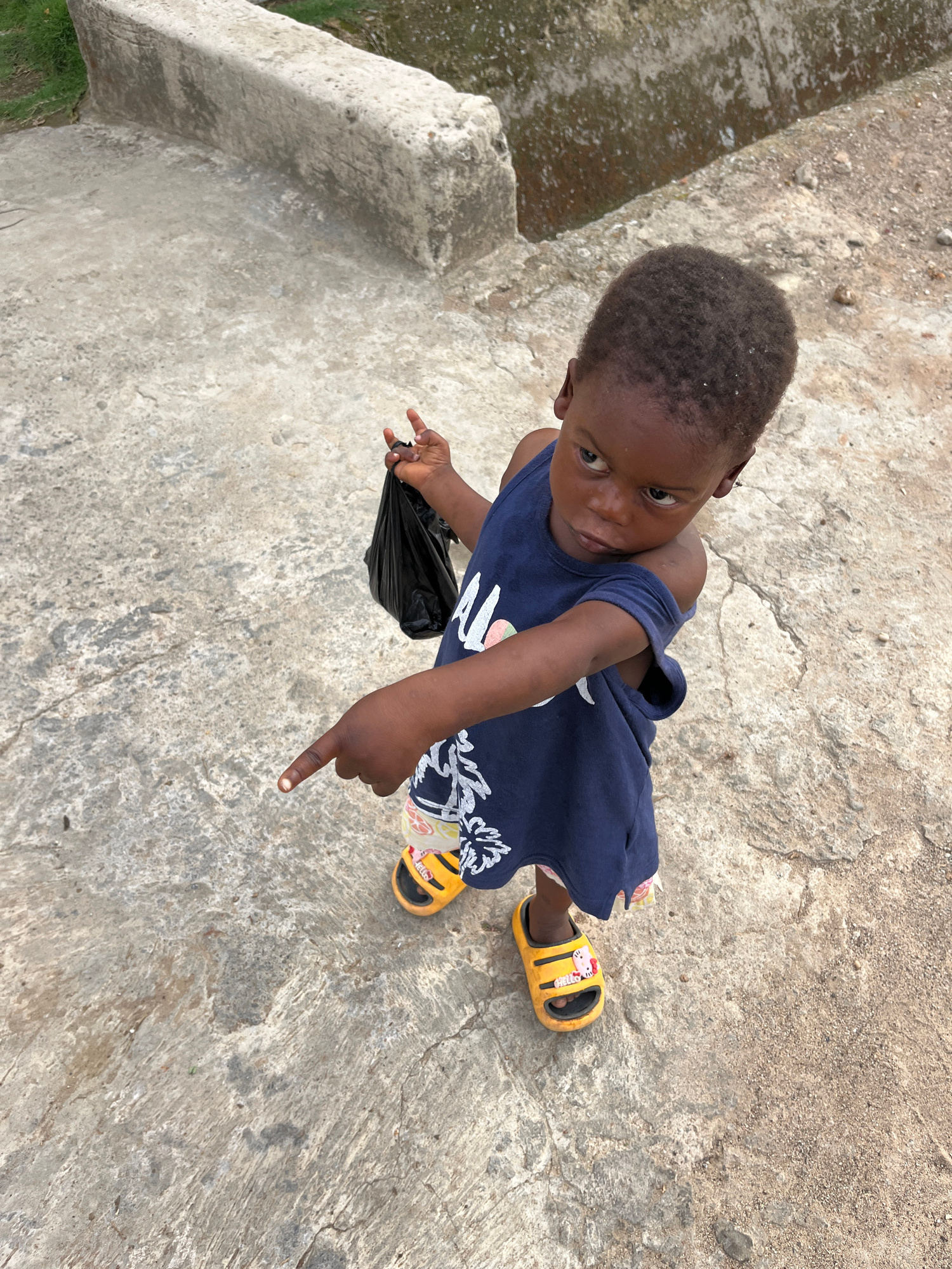 A young child stands on a concrete surface. The child is Black, has short, dark hair, and wears a navy-blue dress with light-colored floral patterns and yellow sandals. The child is holding a black ob…read more