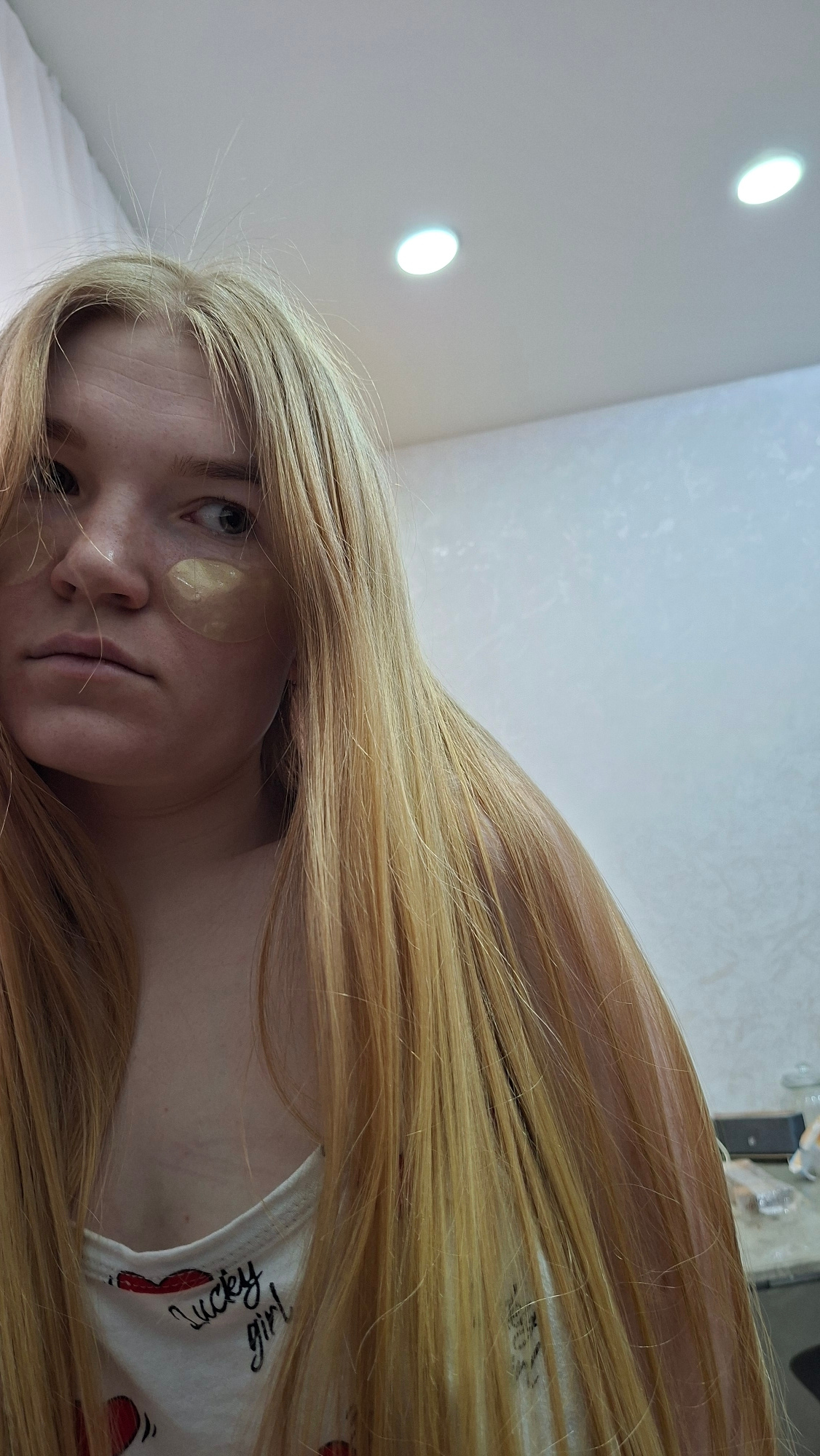 A young person with long, straight blonde hair lies or reclines in an indoor setting. The image is taken from a low angle, looking upwards towards the subject and a white ceiling with two bright reces…read more