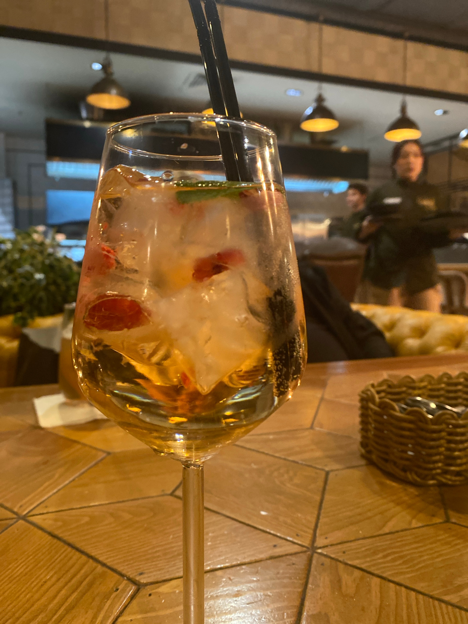 A close-up, high-angle shot shows a stemmed glass filled with liquid, ice, and fruit. Two black straws are inserted into the glass. The drink is placed on a wooden table with a geometric pattern. In t…read more