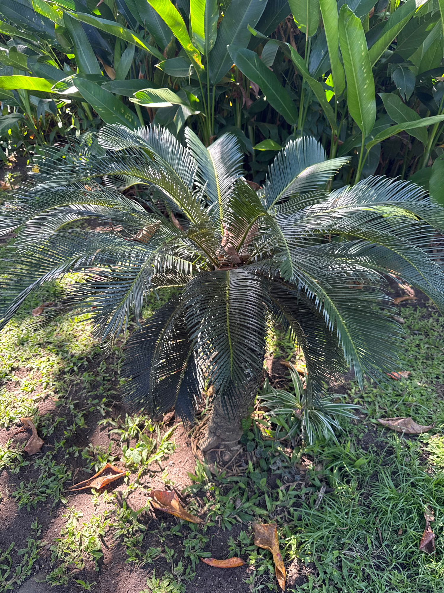 The image depicts a Sago Palm (Cycas revoluta) in Kuta Selatan, Indonesia. The plant is centrally located, surrounded by greenery that includes other types of plants, grass, and ground cover. The grou…read more